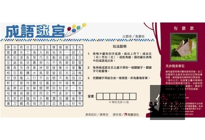 出題者/黃慶桓 玩法說明 1.表格中藏有四字成語,或由上而下,或由左(右)而右(左),或對角線,請把藏在表格中的成語找出來。 2.每兩個成語交叉之處可得到一個關鍵字。關鍵字可重複使用。 3.把關鍵字再組合成一個俚語,即是最後答案。 美術設計/謝東芸 提供者/有鹿文化