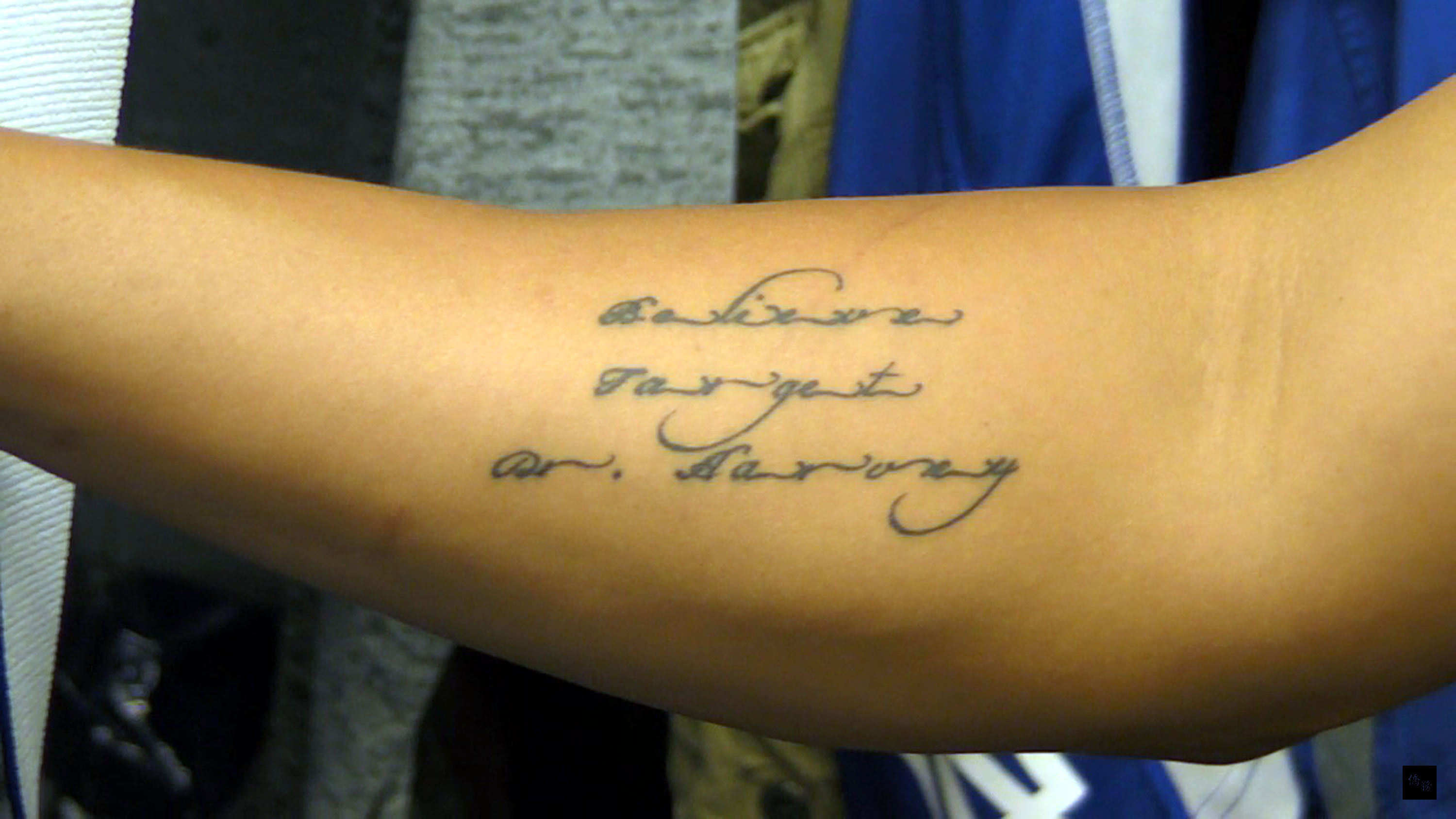 刺青雖是用英文字母刺成,但刺起來像草書般龍飛鳳舞,一般人看不出是什麼意思。只是郭泓志也不願透露,他強調,只是一個意思而已,沒有特別的意義,對他而言只是個人的感覺。