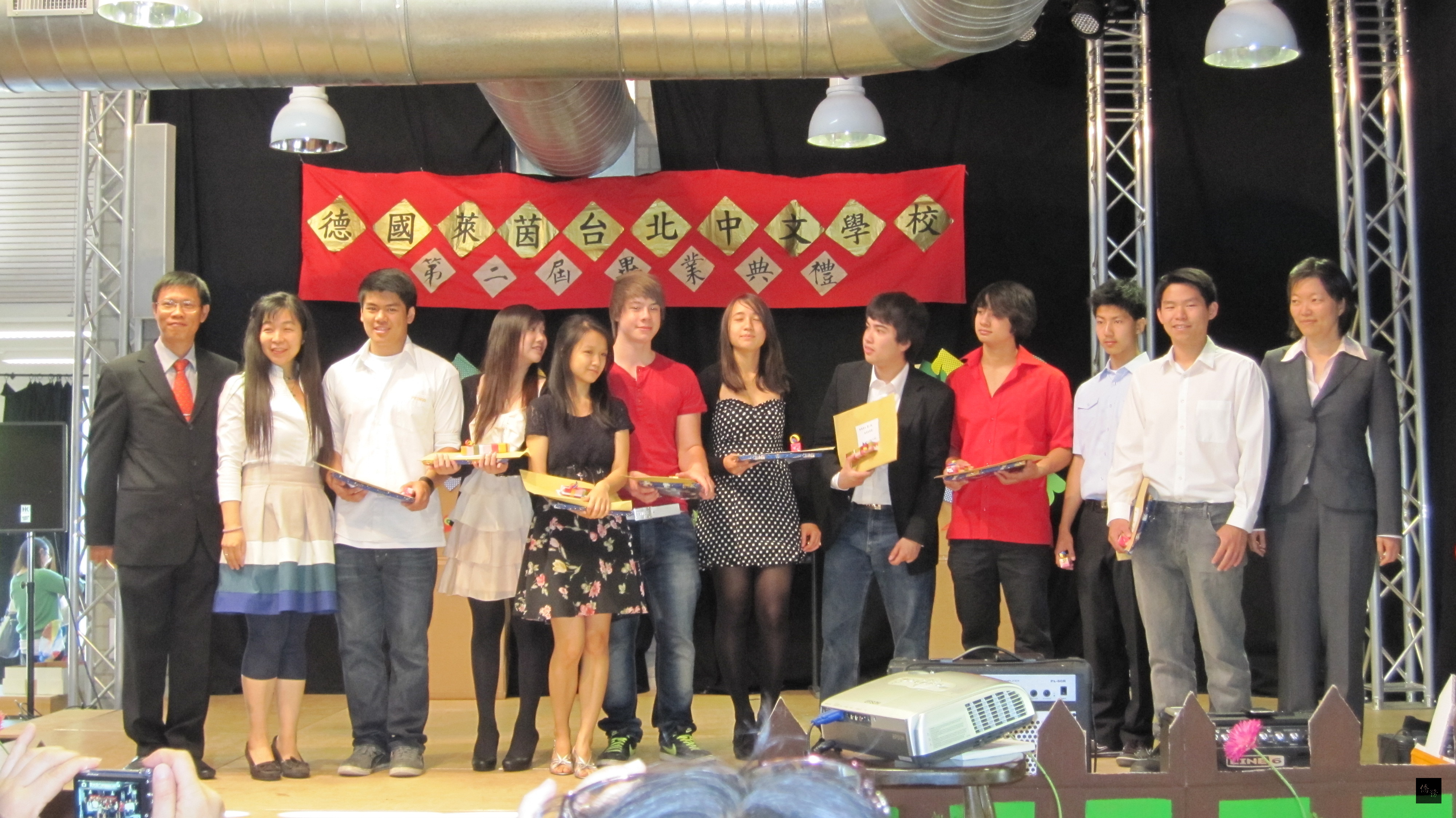 萊茵台北中文學校日前隆重舉行畢業典禮暨學習漢字成果展活動,計有200多名學生、家長參與。現場佈置展示各學年級的學習成果,如寫字練習、作文、新詩寫作、書法、剪紙等等。 畢業典禮由校長邱義喜頒發十位學生畢業證書以揭開序幕,接著畢業班同學、各年級學生帶來一連串的才藝表演,穿插畢業學生發表在萊茵台北中文學校學習的點點滴滴,讓台下學生家長感動不已。 萊茵台北中文學校早期由萊茵區台商們推動成立,14年來堅持正體字教學,亦仿照台灣的六年級制,每兩年為一學年,今年是為第二屆的畢業生舉行畢業典禮。