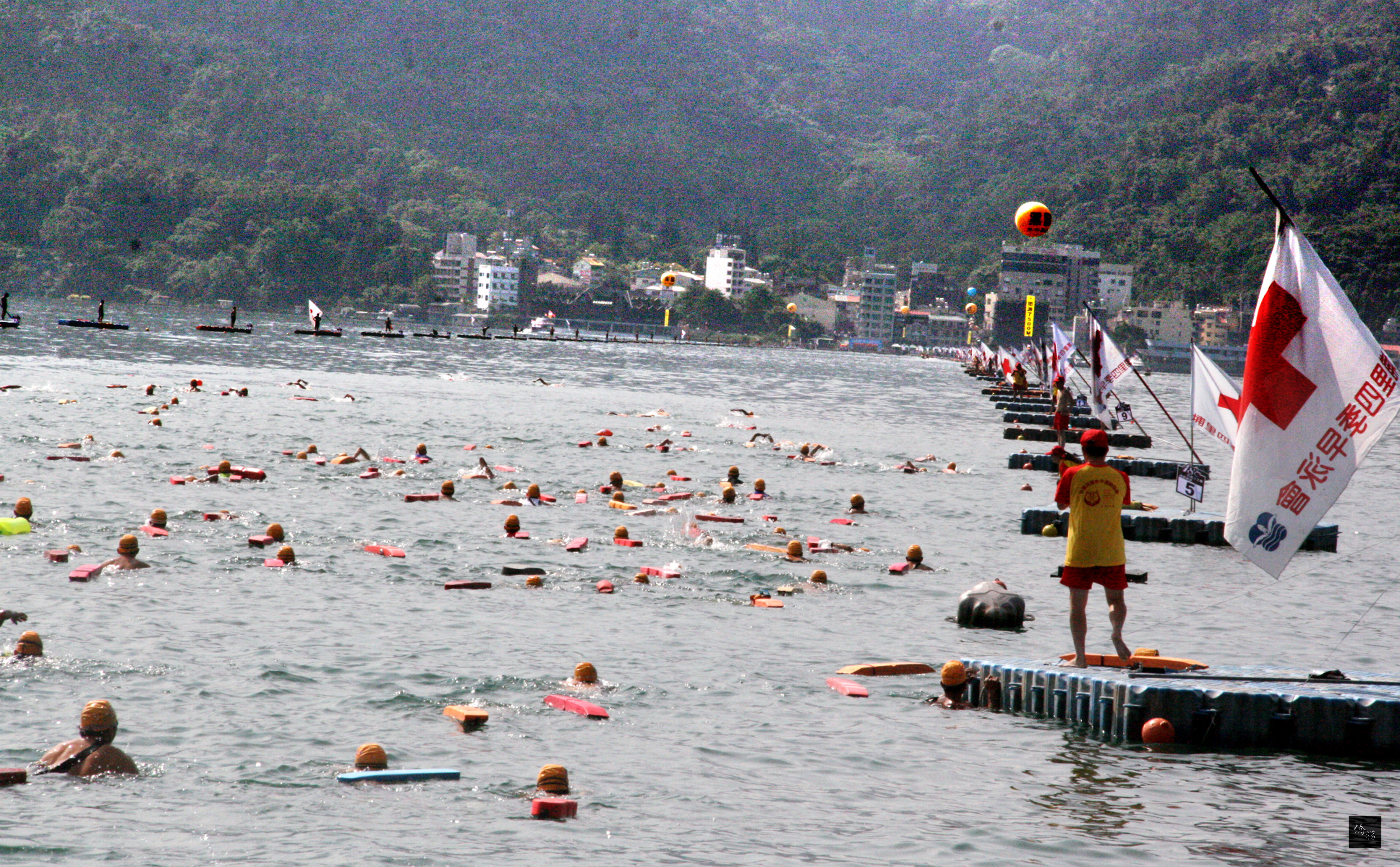 參加日月潭泳渡競賽的300多名國內外選手,上午9時起自朝霧碼頭下水出發,沿著水道向伊達邵碼頭奮力挺進,挑戰最短時間征服全程3公里的泳距。