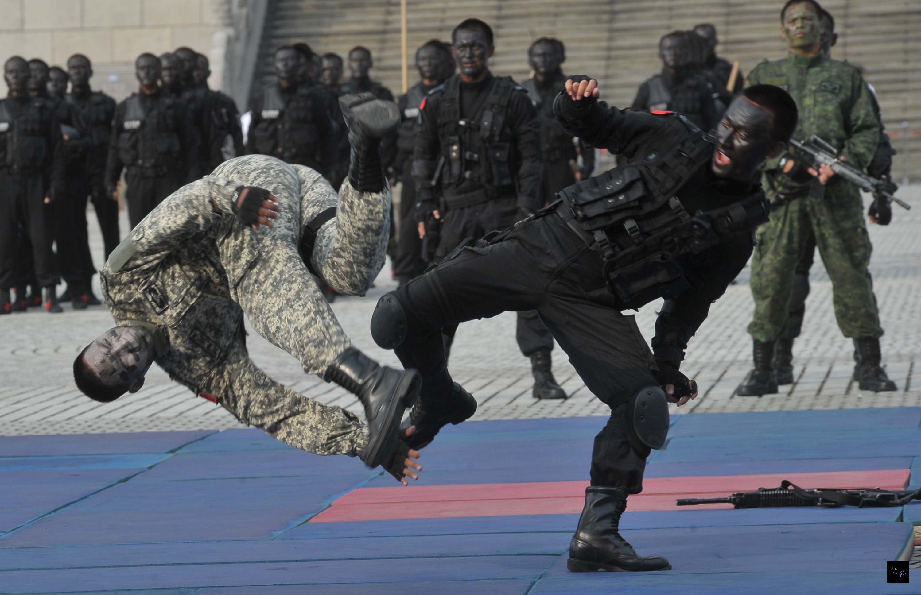 俗稱「涼山特勤隊」的陸軍高空特勤中隊日前現身自由廣場,預演國慶日國防展演「戰技表演」項目,實施格鬥戰中的奪刀、槍與棍等訓練,現場吸引許多民眾圍觀、拍照。