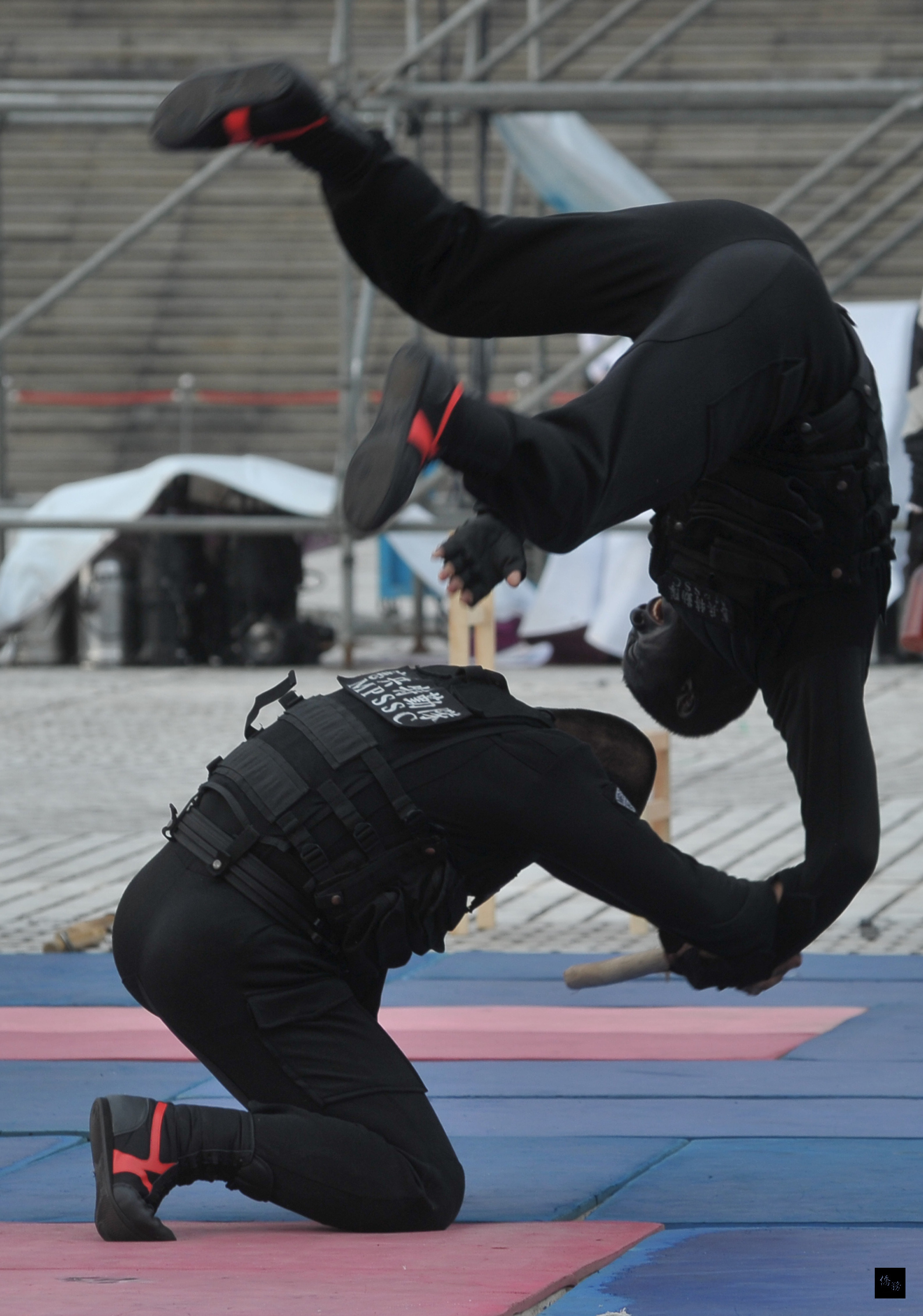 梁山特勤隊弟兄現身,表演特勤戰技訓練,包含擒拿、奪刀、奪槍、刺槍等項目;精采的表演,吸引不少民眾爭相拍照。