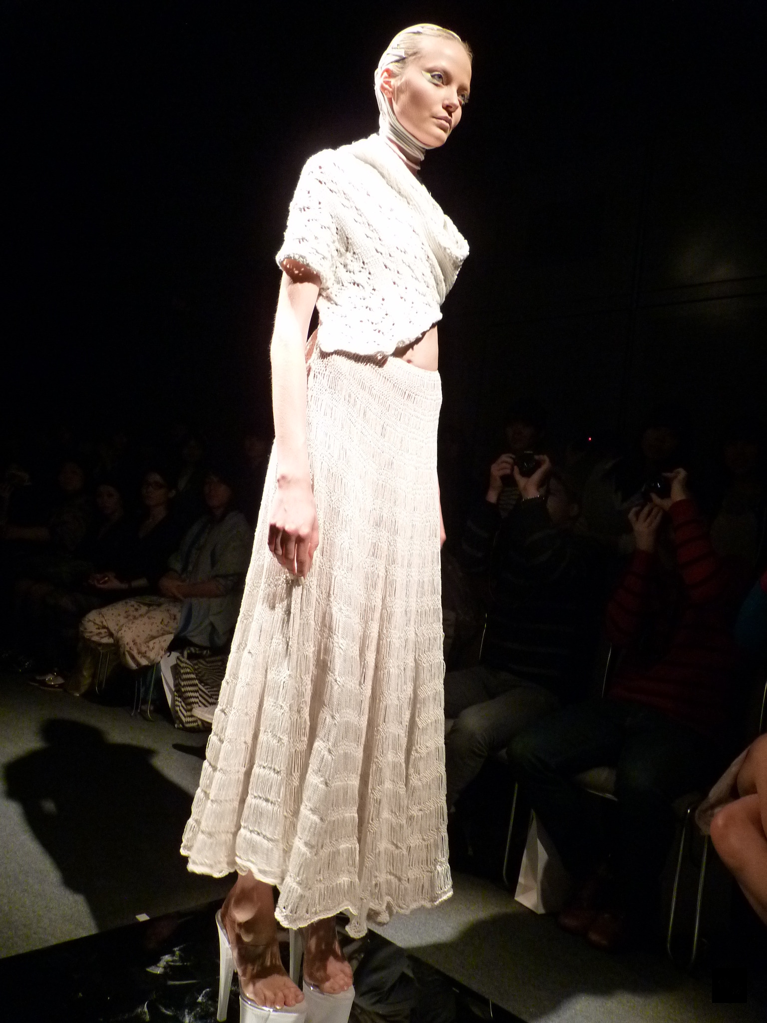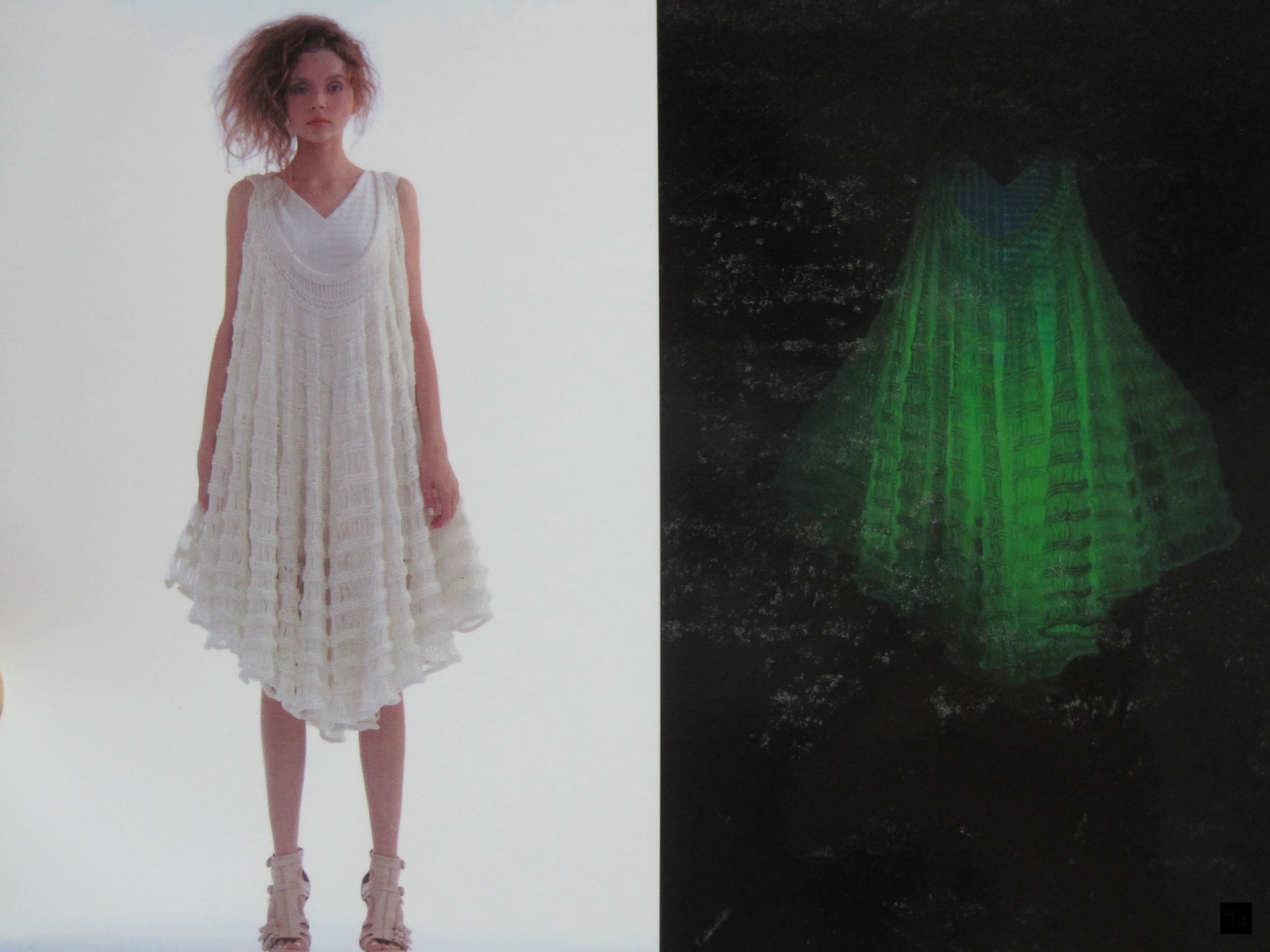 古又文在東京熱鬧的原宿舉辦首場個展,展示24件編織禮服,這些服裝可在白天吸取太陽光,夜晚參加派對時就會自動且持續地發光。