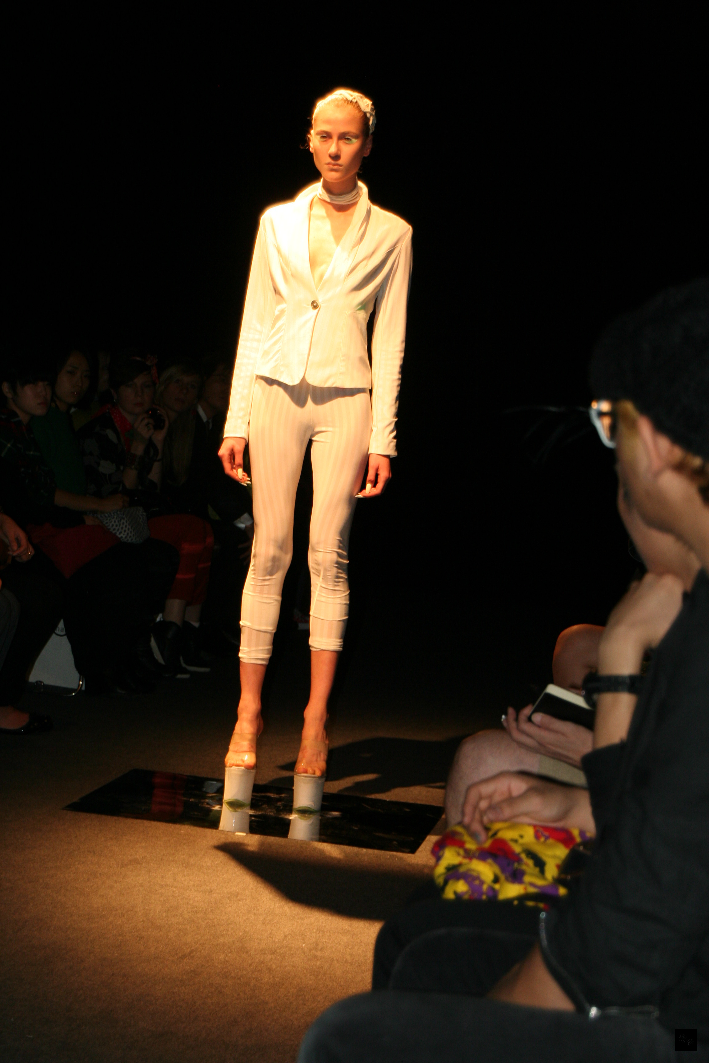 展示場沒架設高高的舞台,而是模特兒與觀眾在同一平台,在漆黑的空間裡,模特兒一出場,露出綠色夜光,走到一個定點,燈光瞬間打亮,令人驚豔。