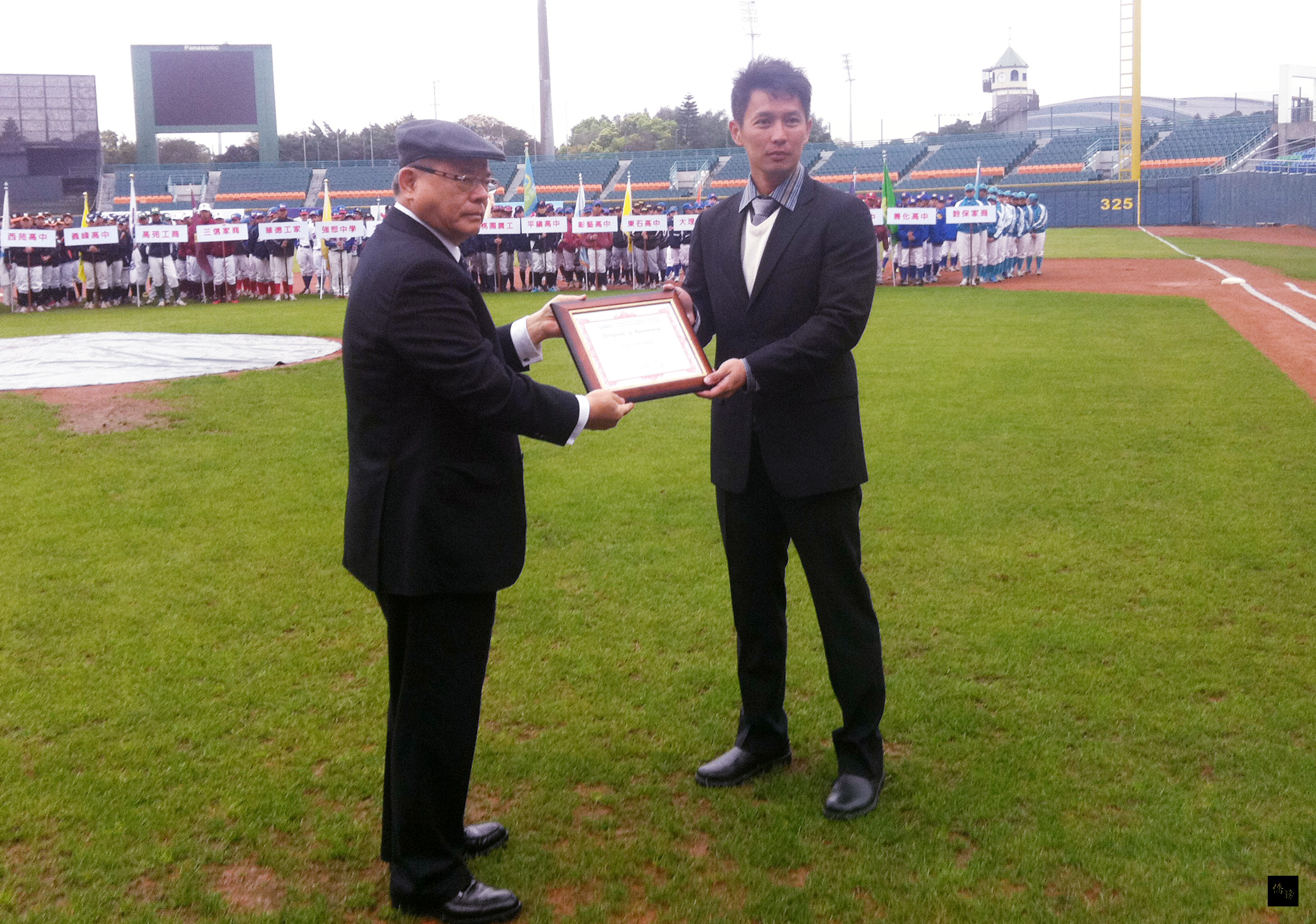 青棒菁英大賽8日在新莊棒球場開幕,統一獅選手高志綱從國際棒總執行委員彭誠浩手中接下國際棒總(IBAF)球員代表的聘書,高志綱表示,希望能整合選手資源,幫助棒球回到奧運。