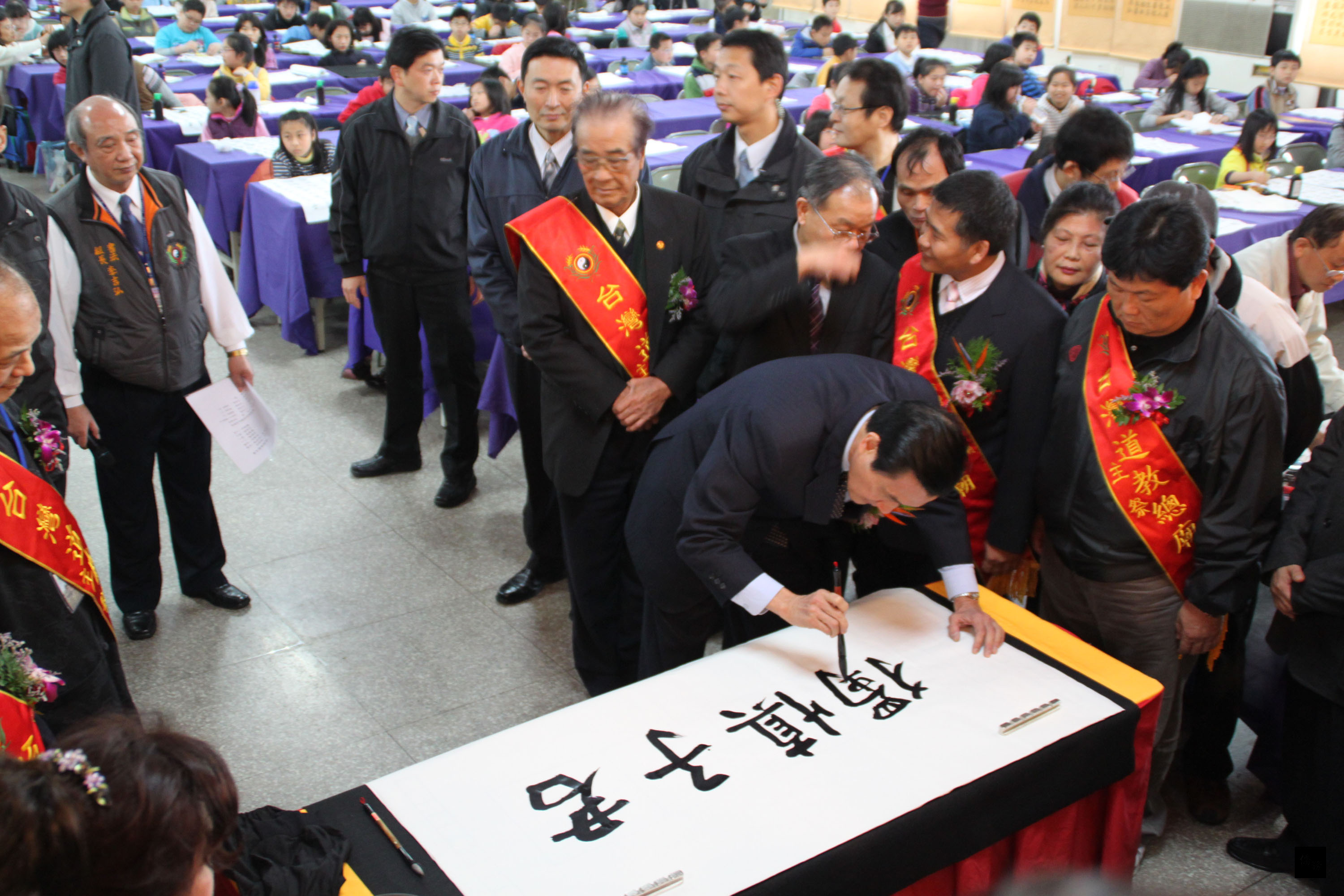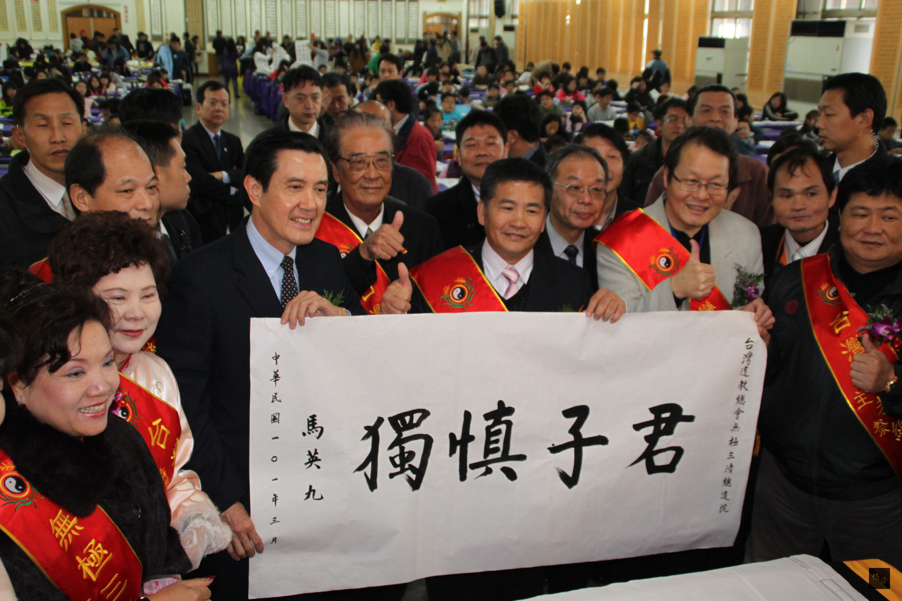 在教育部長蔣偉寧、立委顏清標及台中市副市長蕭家淇的陪同下,馬總統10日到台中外埔區參加無極三清總道院舉辦的「三獻壽禮大典」,並與在場信徒親切互動,也品嚐在地的米食小吃。 三獻禮結束後,總統順道參觀第15屆中原盃書法比賽,並為得獎者頒獎,總統勉勵在場的小朋友,養成練書法的習慣對未來有很大的意義,因為他也是從小一直練書法直到高中,覺得一生「受惠無窮」。 總統當場揮毫寫下「君子慎獨」,他說,2年前他來造訪時寫的是「率性之道」,與「君子慎獨」都語出中庸。總統並朗誦了中庸第一章的文句與大家分享。
