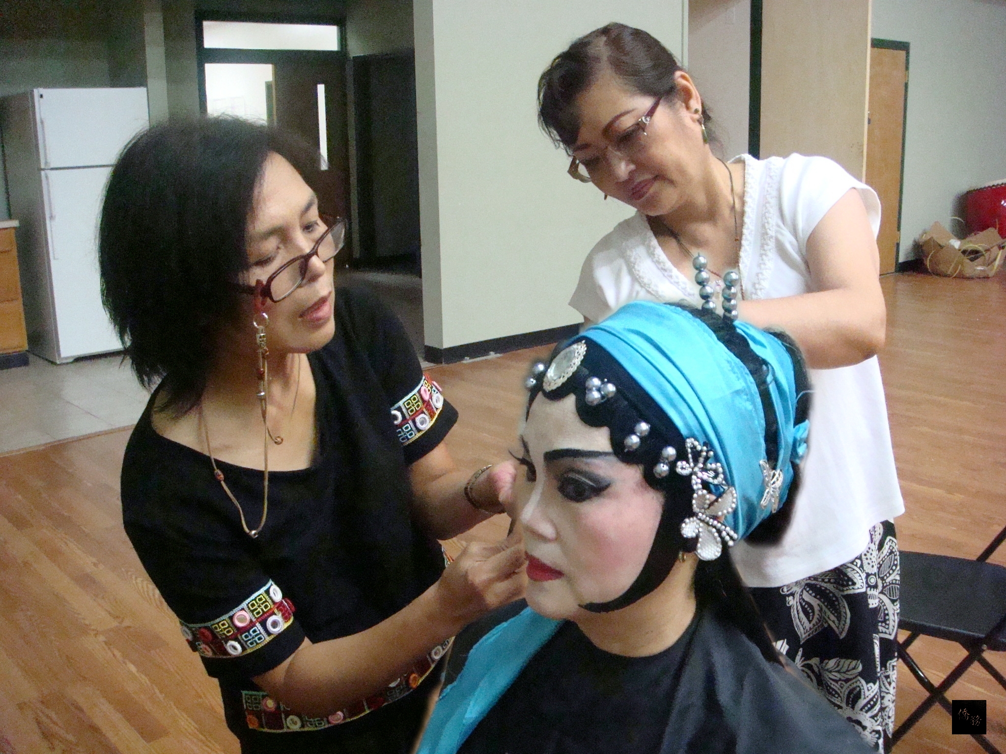 台美學校歌仔戲研究班日前舉辦傳統歌仔戲中「北管妝」的裝扮研習課,指導老師陳淑女示範今年回台學到的苦旦梳妝技巧,經過3個多小時的巧手辛勞,終於完成美麗舞台妝,讓學員感受到傳統戲曲妝扮,竟是如此費時費工。