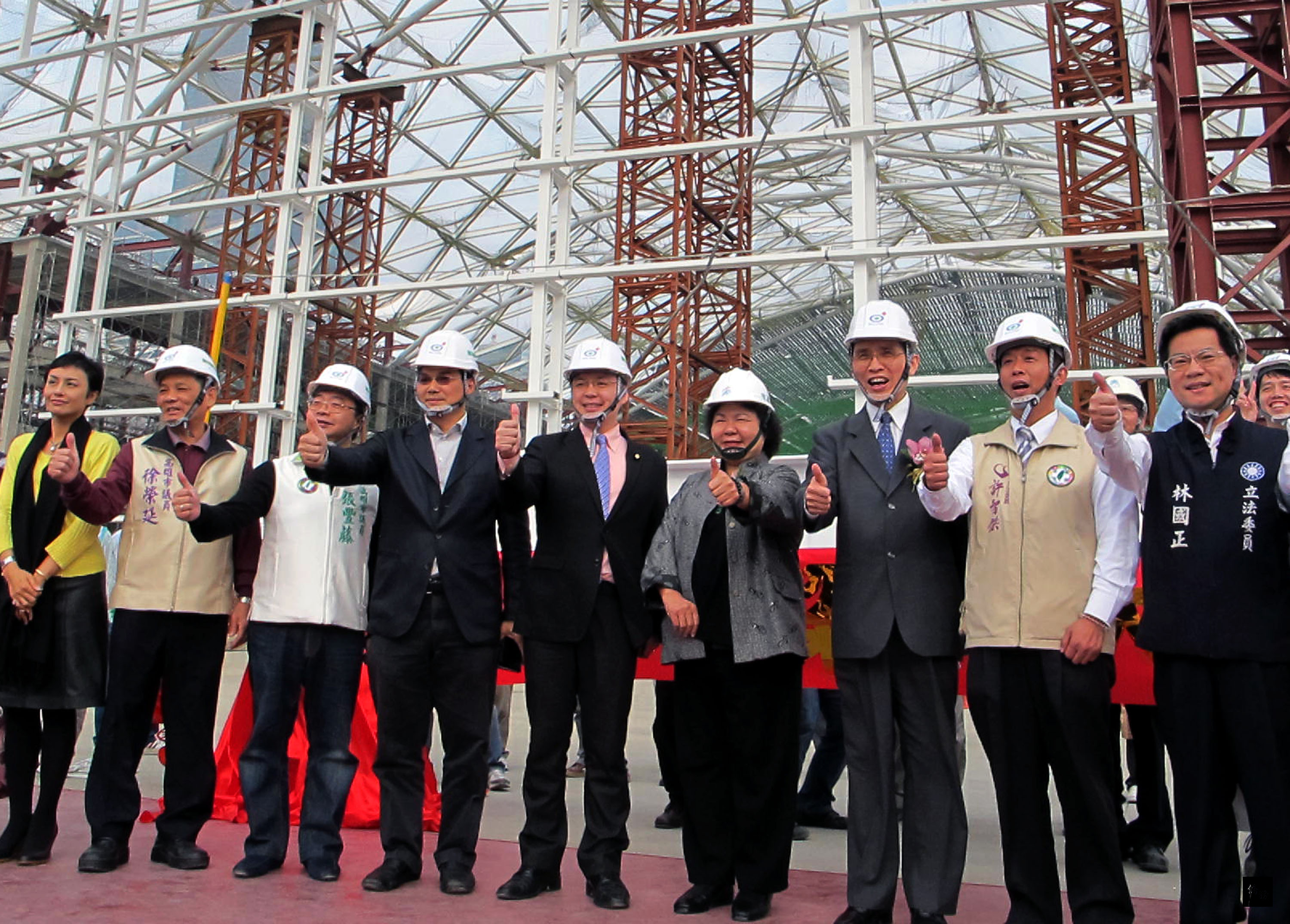 高雄世界貿易展覽會議中心工程進度47%,去年12月25日上梁,經濟部長施顏祥與高雄市長陳菊期待帶來商機,預估年產值新台幣46億元。