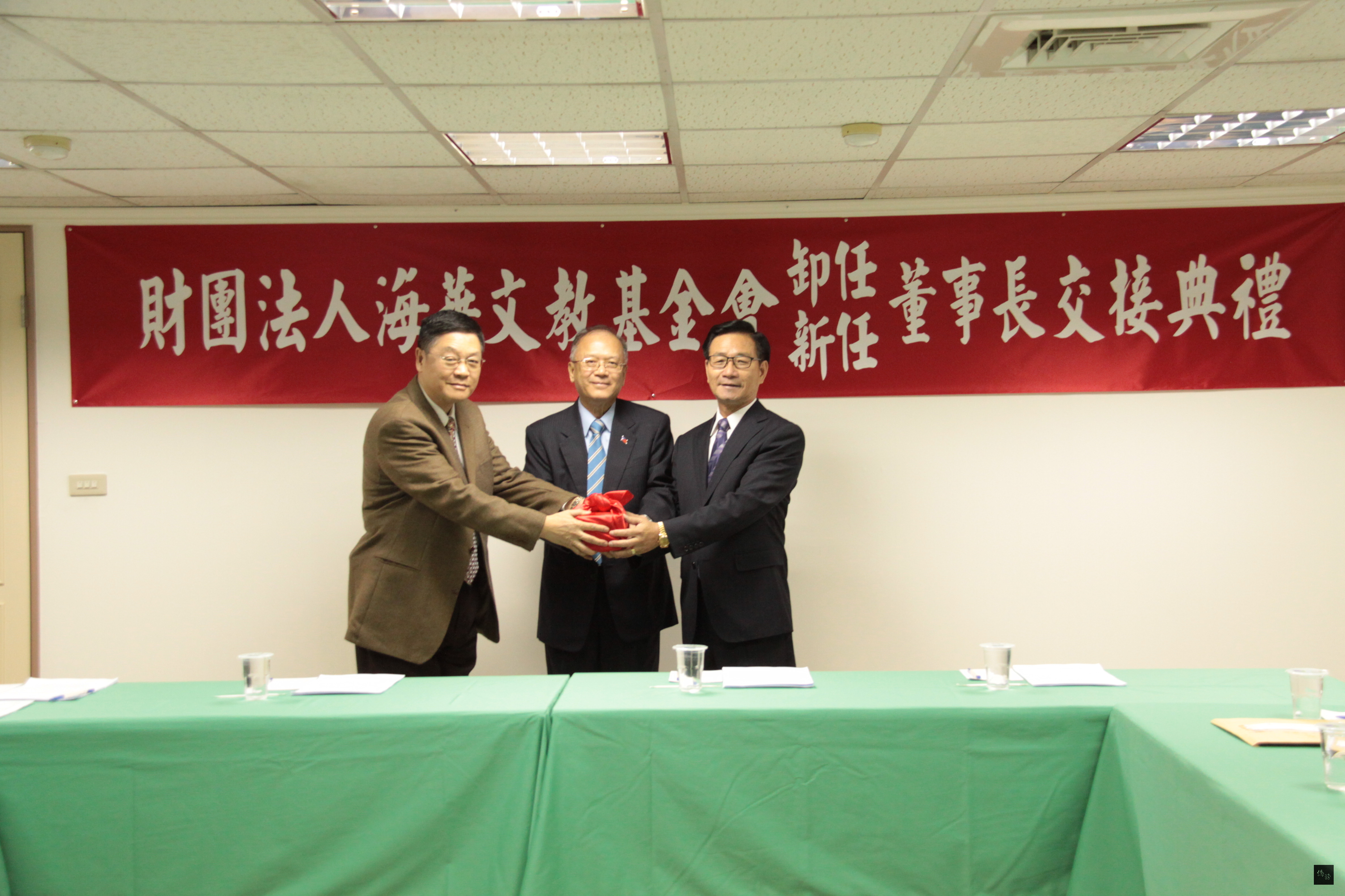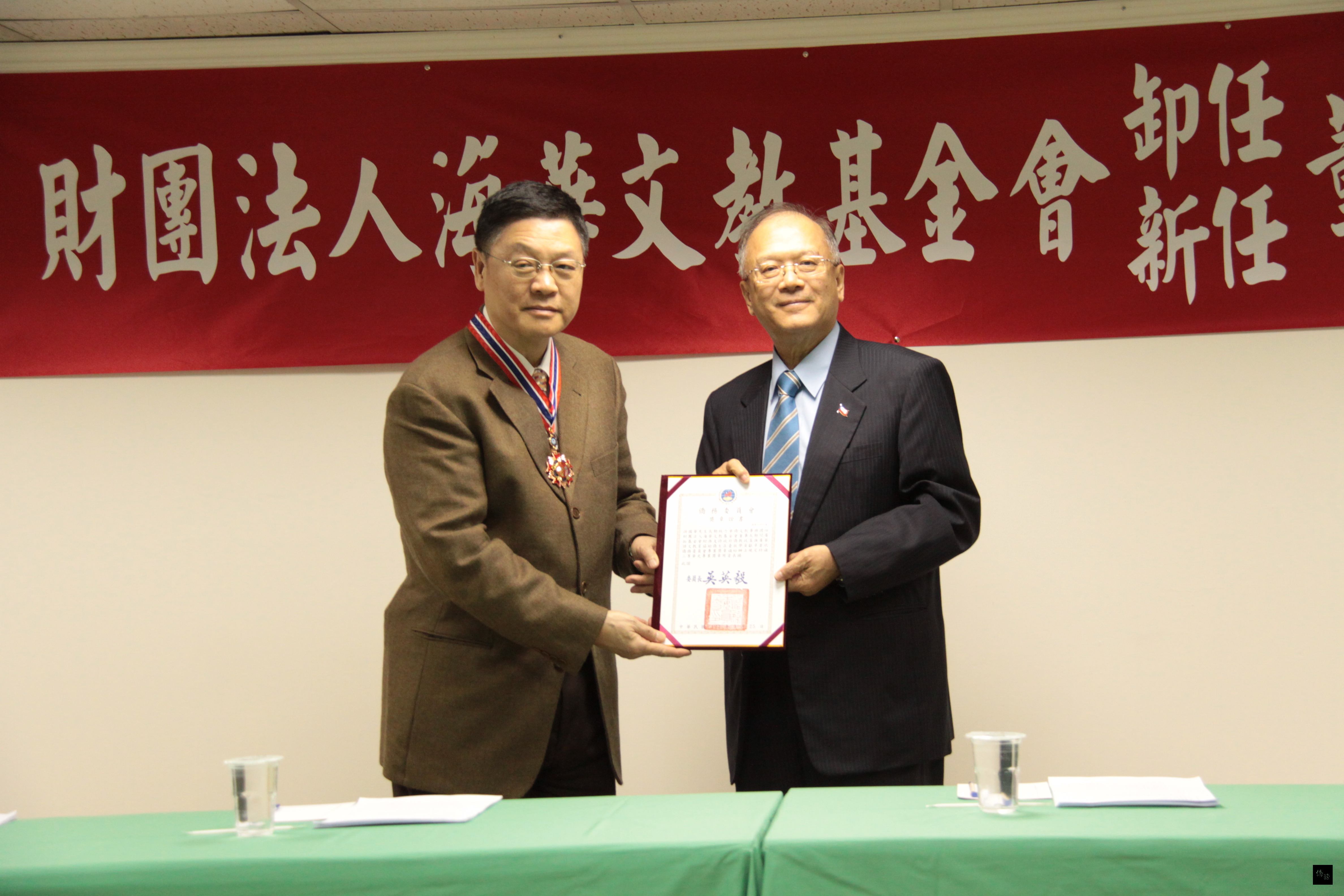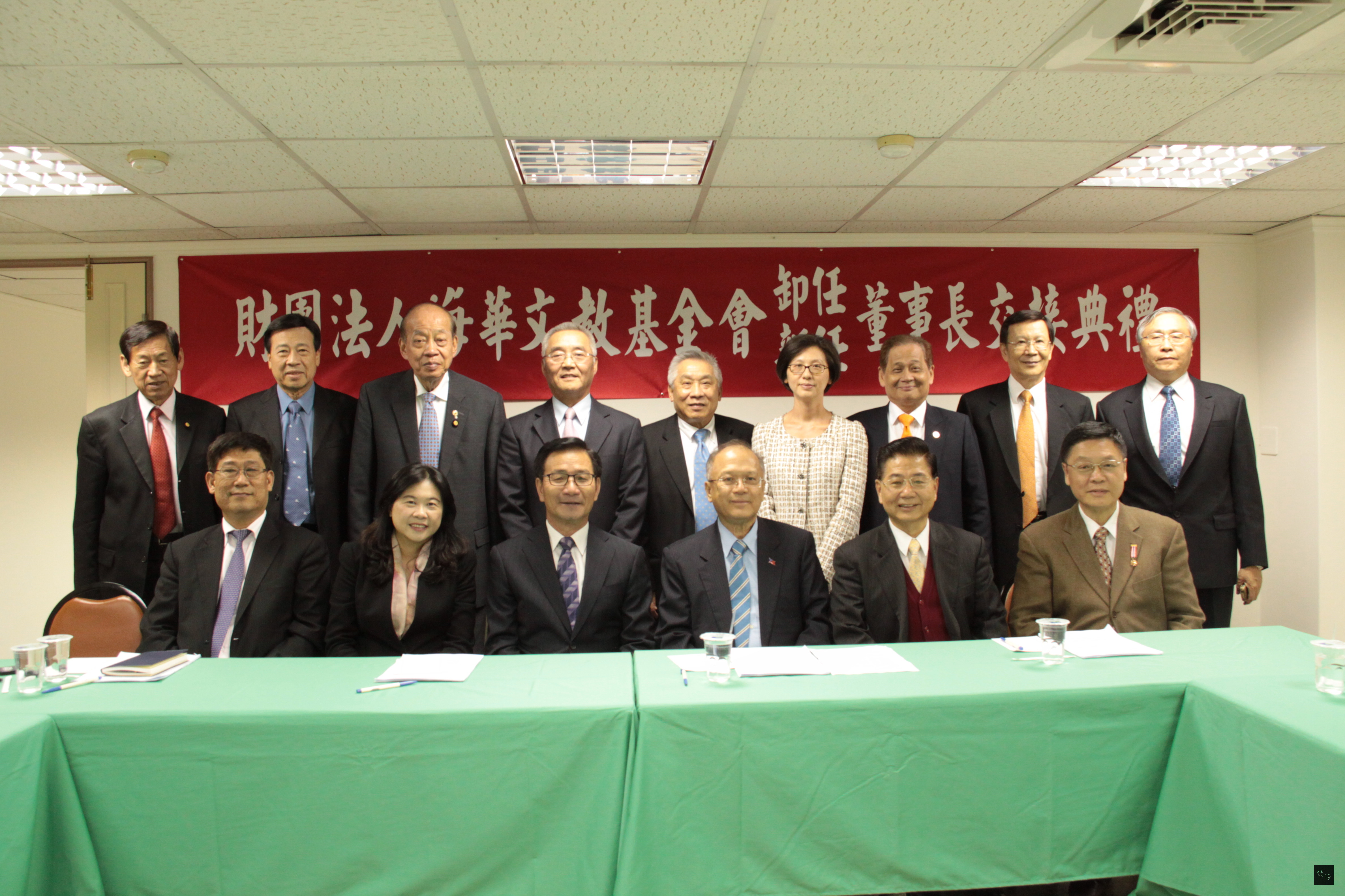 財團法人海華文教基金會25日舉行新、卸任董事長交接典禮,在僑委會委員長吳英毅的監交下,董事長孫國華將印信移交給新任董事長吳松柏,擔任副董事長的僑委會副委員長任弘,以及包括前台北市副市長李永萍等董事們都出席觀禮。