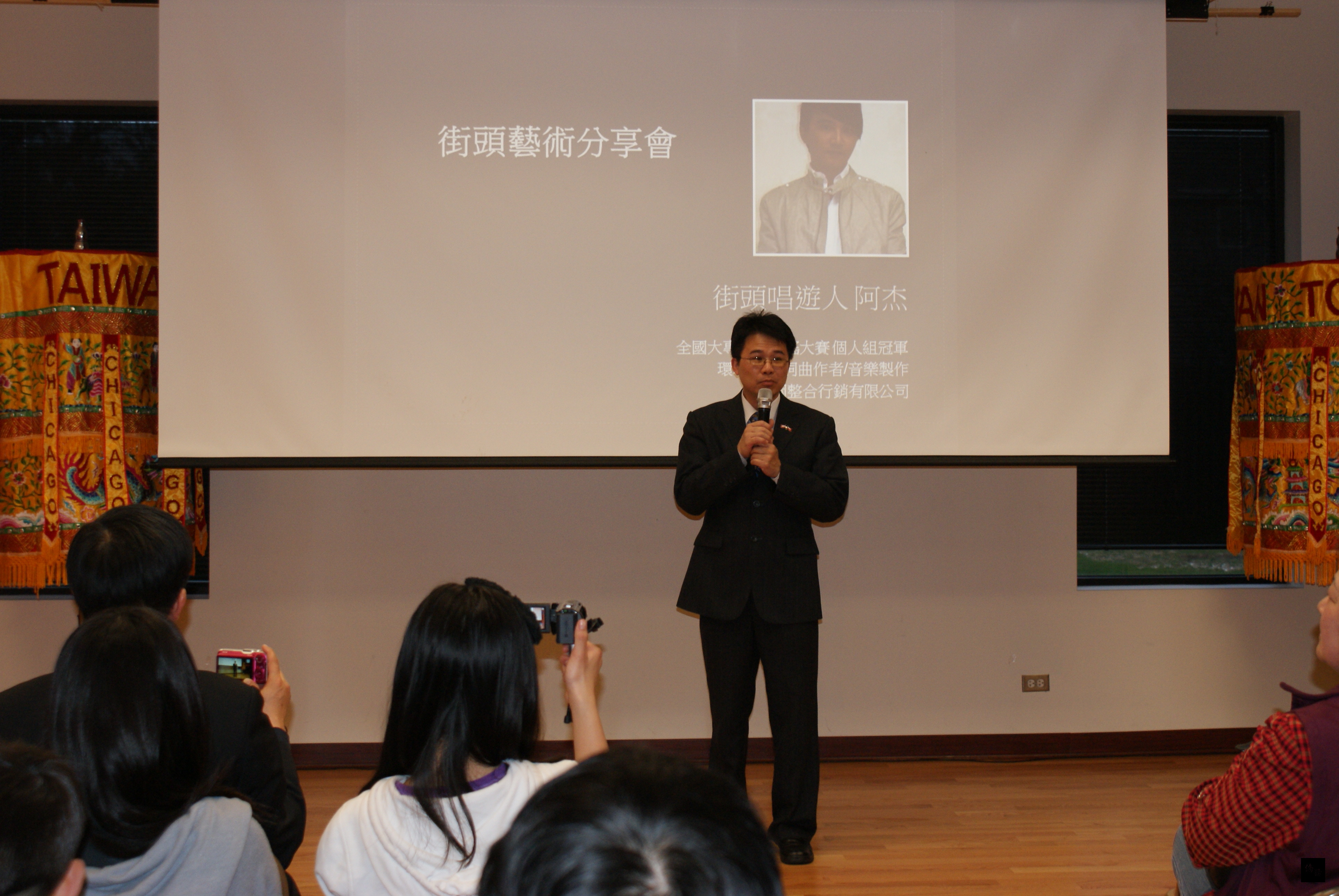 芝加哥海外青少年文化大使協會(Formosa Association of Student Cultural Ambassadors,簡稱FASCA)日前舉辦重聚聯誼會,邀請甫於UIC(伊利諾州州立大學芝加哥分校)歌唱大賽獲第2名的台灣街頭藝人徐志杰於芝加哥僑教中心進行台灣街頭藝術專題講座及現場演唱,並與該協會華裔青少年互動。僑教中心主任閻樹榮及副主任林垙舞應邀與會同樂。