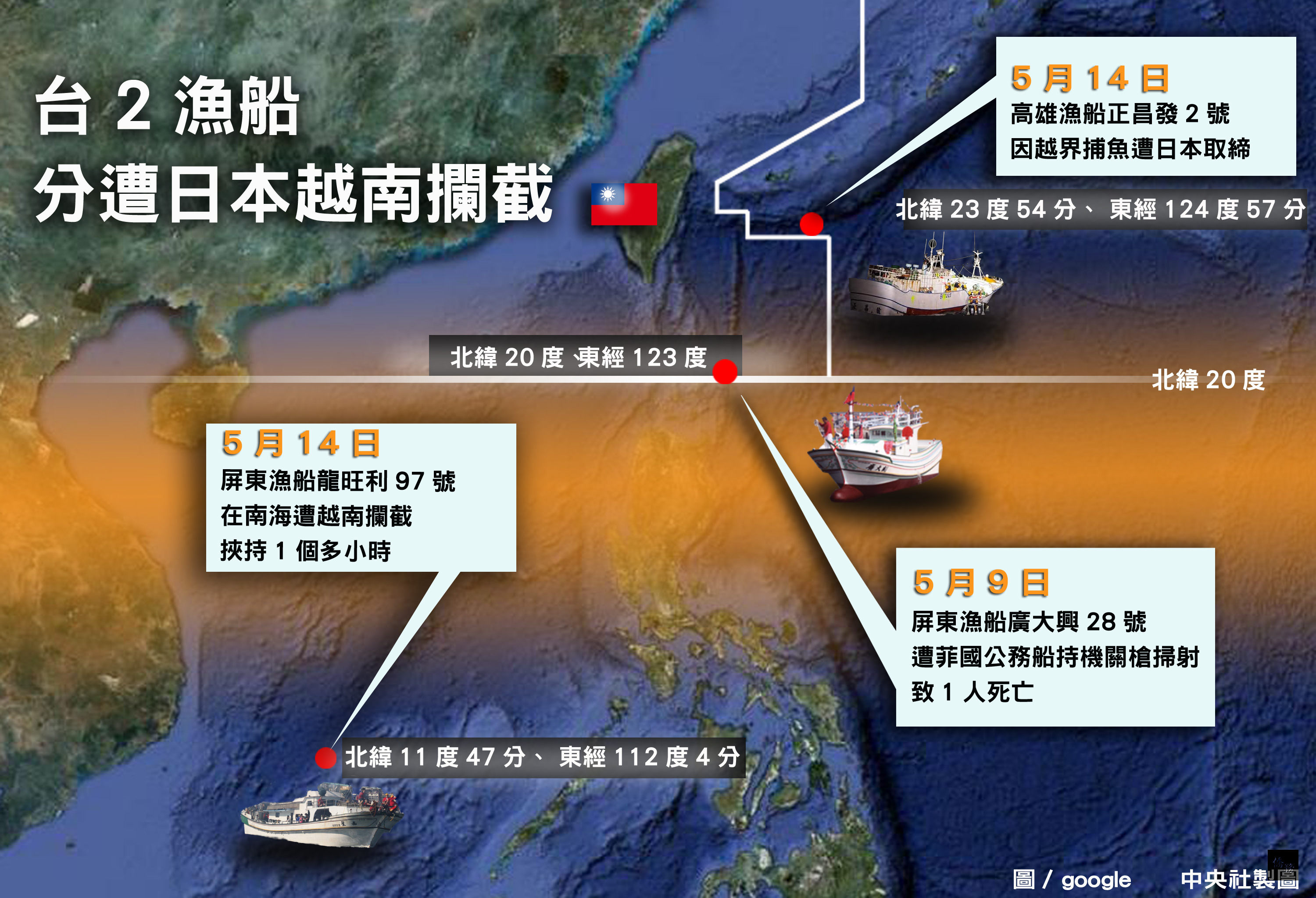 台灣高雄籍漁船「正昌發2號」14日凌晨在日本專屬海域進行捕撈作業,遭日本官方漁業取締船取締,船長孫居民被逮捕後坦承撈過界。 48.25噸重的「正昌發2號」由孫居民和5名船員操控14日凌晨在沖繩(琉球)竹富島海域進行捕撈作業,被日本水產廳所屬的漁業取締船發現,認為這座海域屬日本專屬海域(EEZ),因此逮捕漁船船長。 這是台灣與日本4月10日簽署漁業協議之後,台灣漁船首度被取締。正昌發2號14日凌晨作業的海域是沒爭議性的海域。 孫居民被日方逮捕後,坦承過界捕魚,願意付罰金。