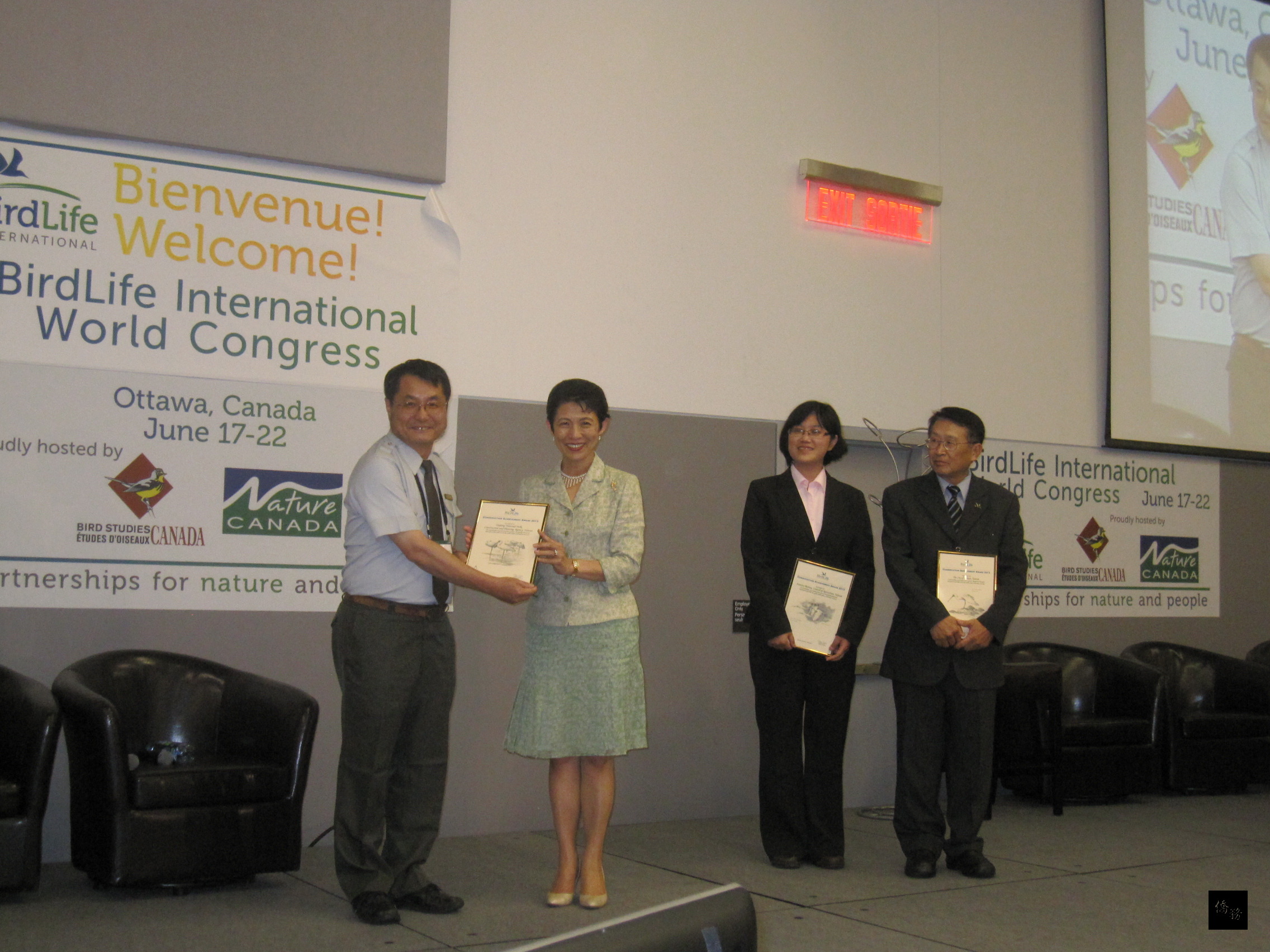 國際保育獎由國際鳥盟榮譽主席日本憲仁親王妃頒發,代表中華民國政府上台領獎的有行政院農業委員會林務局技士陳彥伶、台江國家公園管理處課長黃光瀛以及台南市野鳥學會總幹事郭東輝(代表台南市政府)等3人,駐加拿大代表劉志攻在場觀禮。