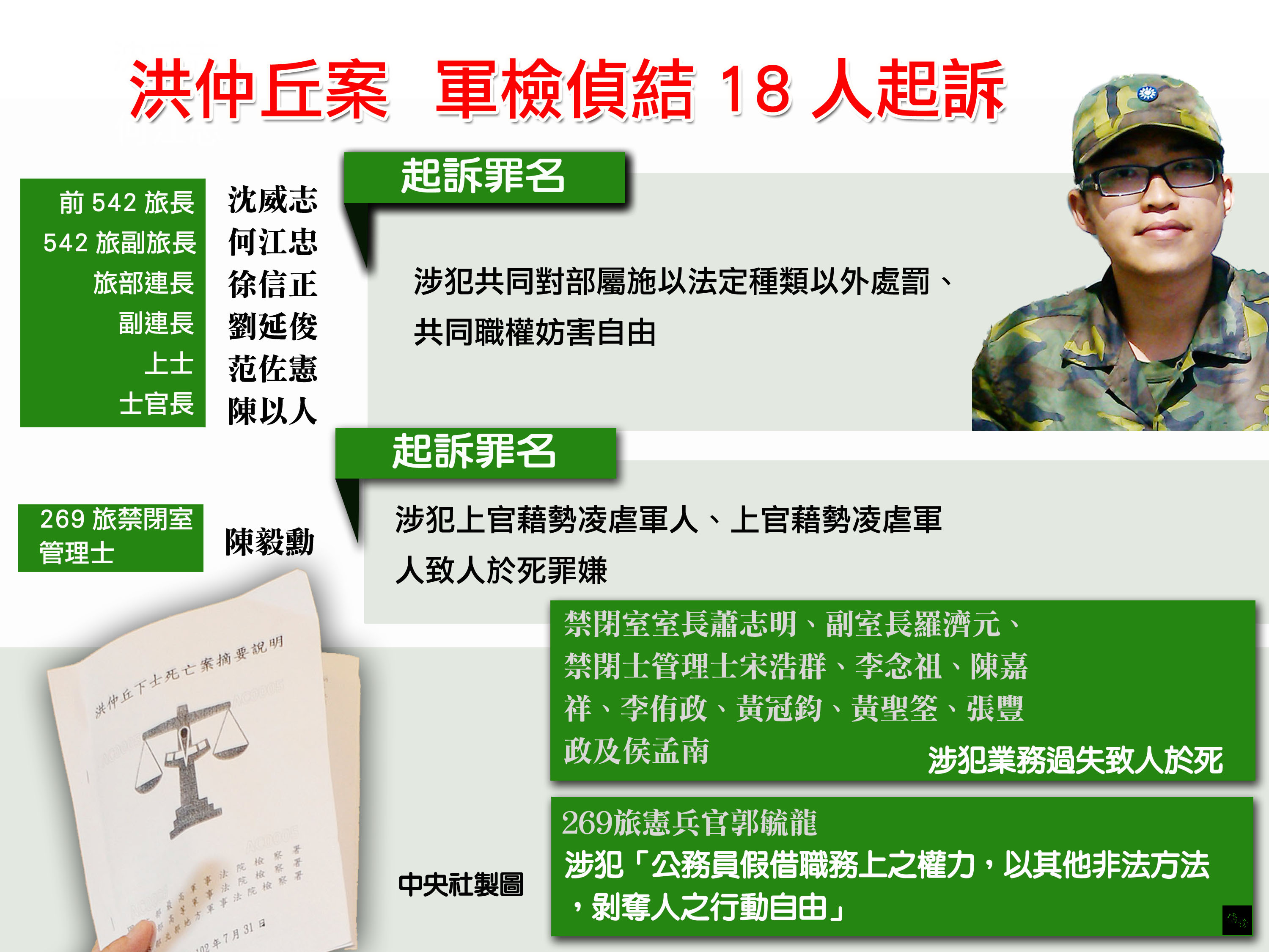 其中,269旅禁閉室管理士陳毅勳,涉犯上官藉勢凌虐軍人、上官藉勢凌虐軍人致人於死罪嫌,最重可處無期徒刑,起訴罪行為18人最重。