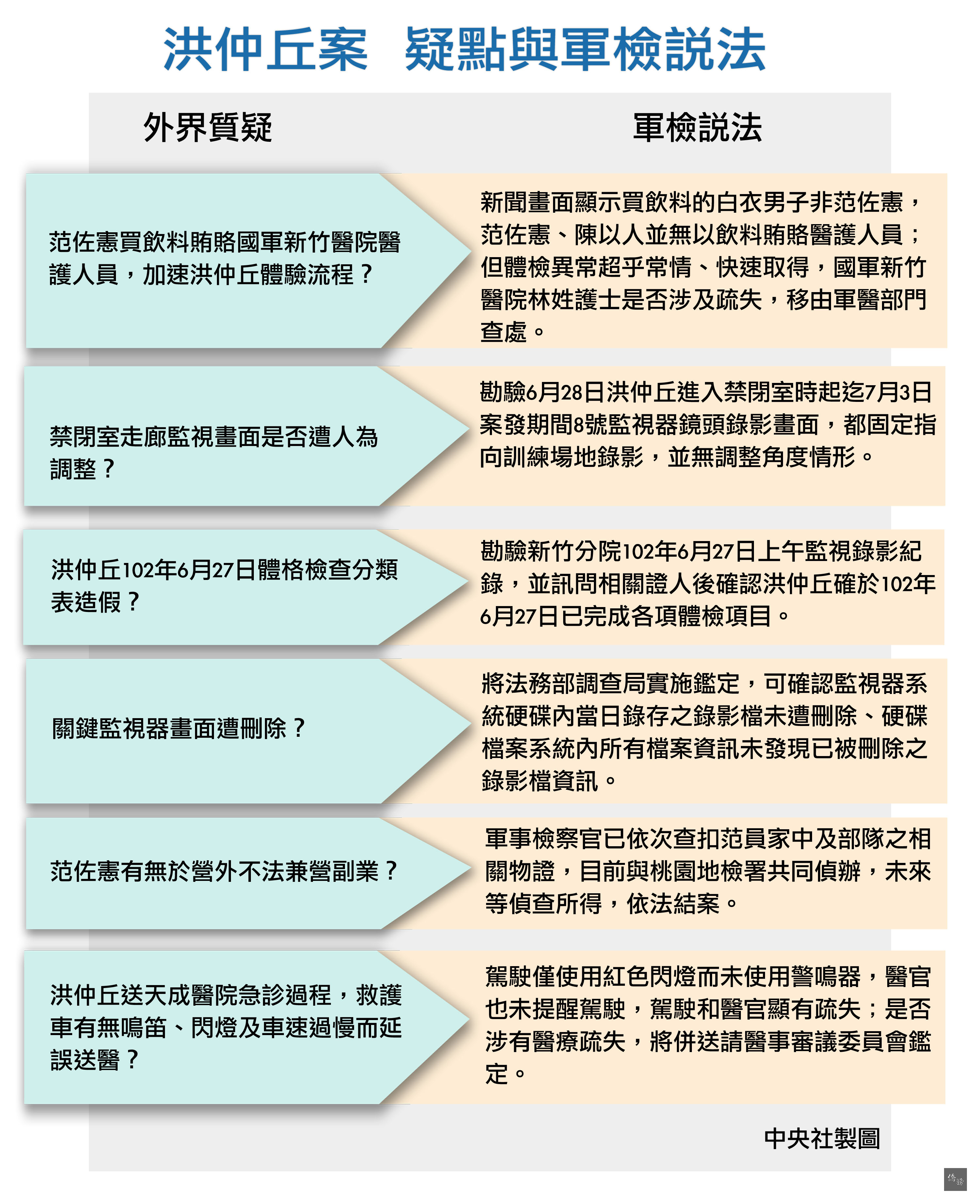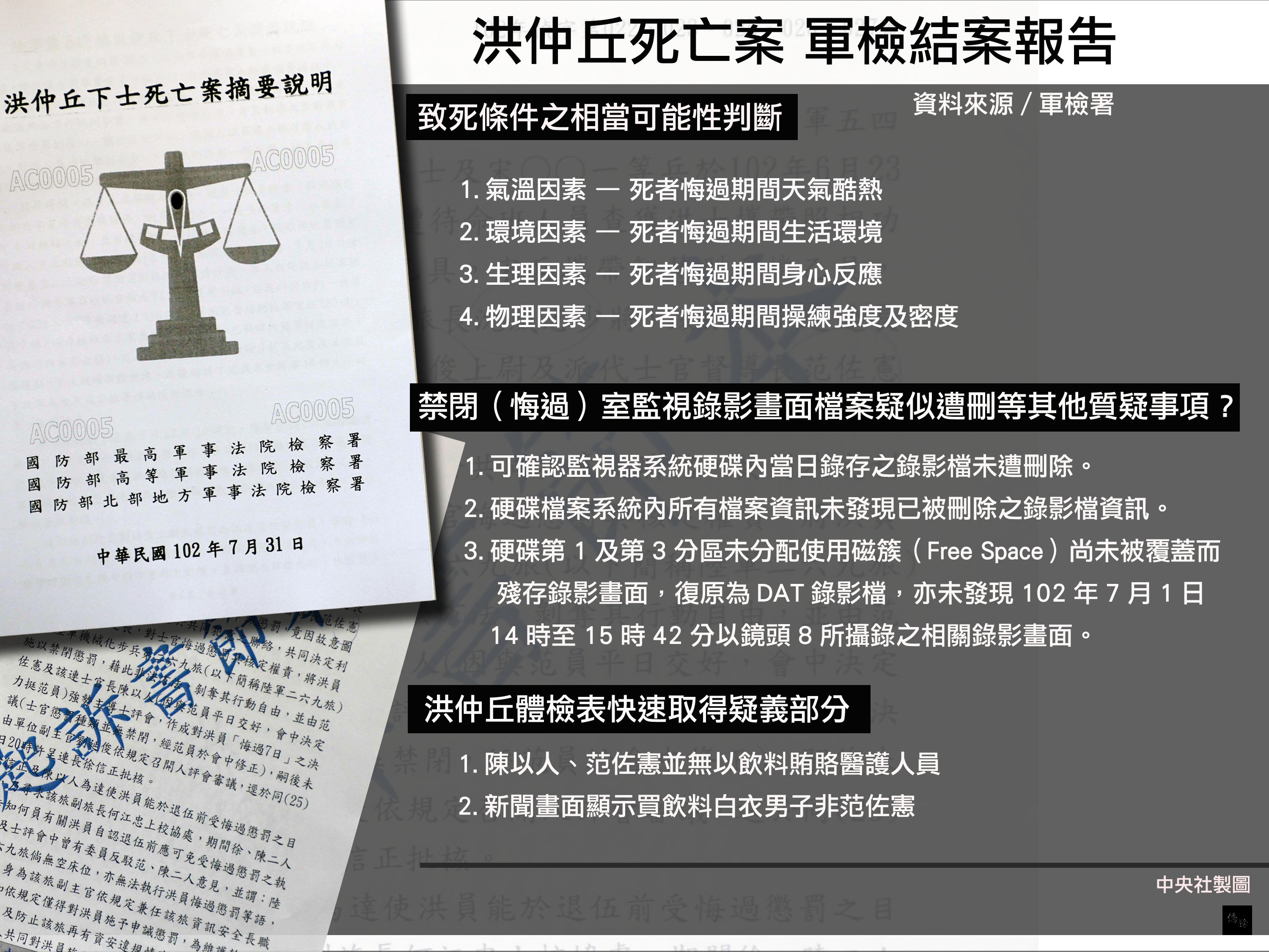 在送洪仲丘悔過處分部分,軍檢報告指出,6月24日上午7時許,劉延俊偕同徐信正及范佐憲討論,徐、范二人因對洪仲丘曾於102年5月6日竄改個人體測成績以爭取提早假而遭查獲,洪仲丘表示日後欲考公職,不希望留下污點,才改罰勤7天,洪事後卻以退伍在即而提出免除值星班長勤務等,早已心生不滿。