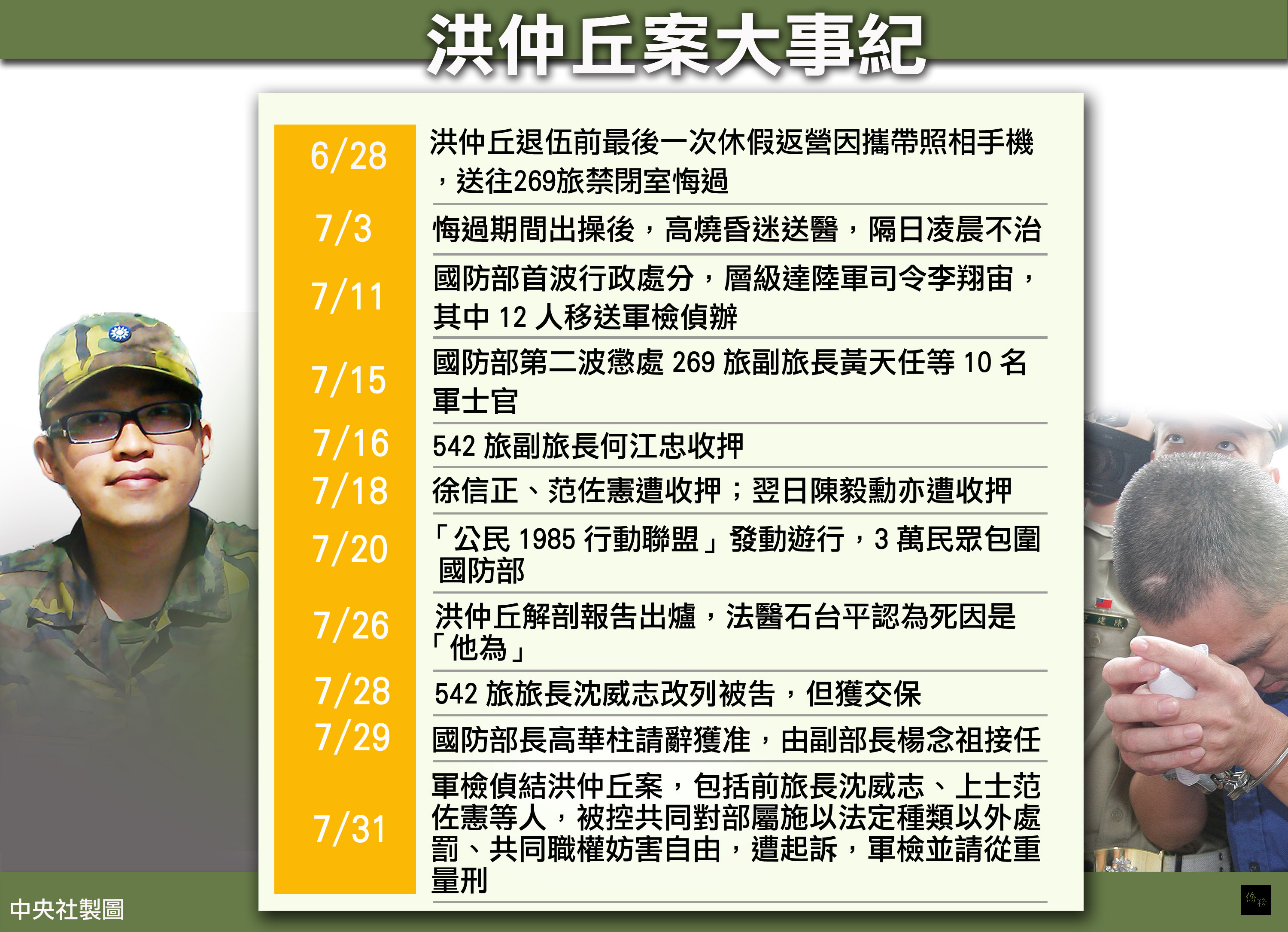 成功大學交通管理系畢業的陸軍義務役下士洪仲丘原本7月6日就要退伍,最後一次放假歸營後,被發現攜帶有照相功能的手機,6月28日被送到楊梅高山頂營區關禁閉(悔過)。7月3日在營區體能訓練後身體不適送醫不治,引發民怨沸騰,網友發起遊行,包圍國防部。