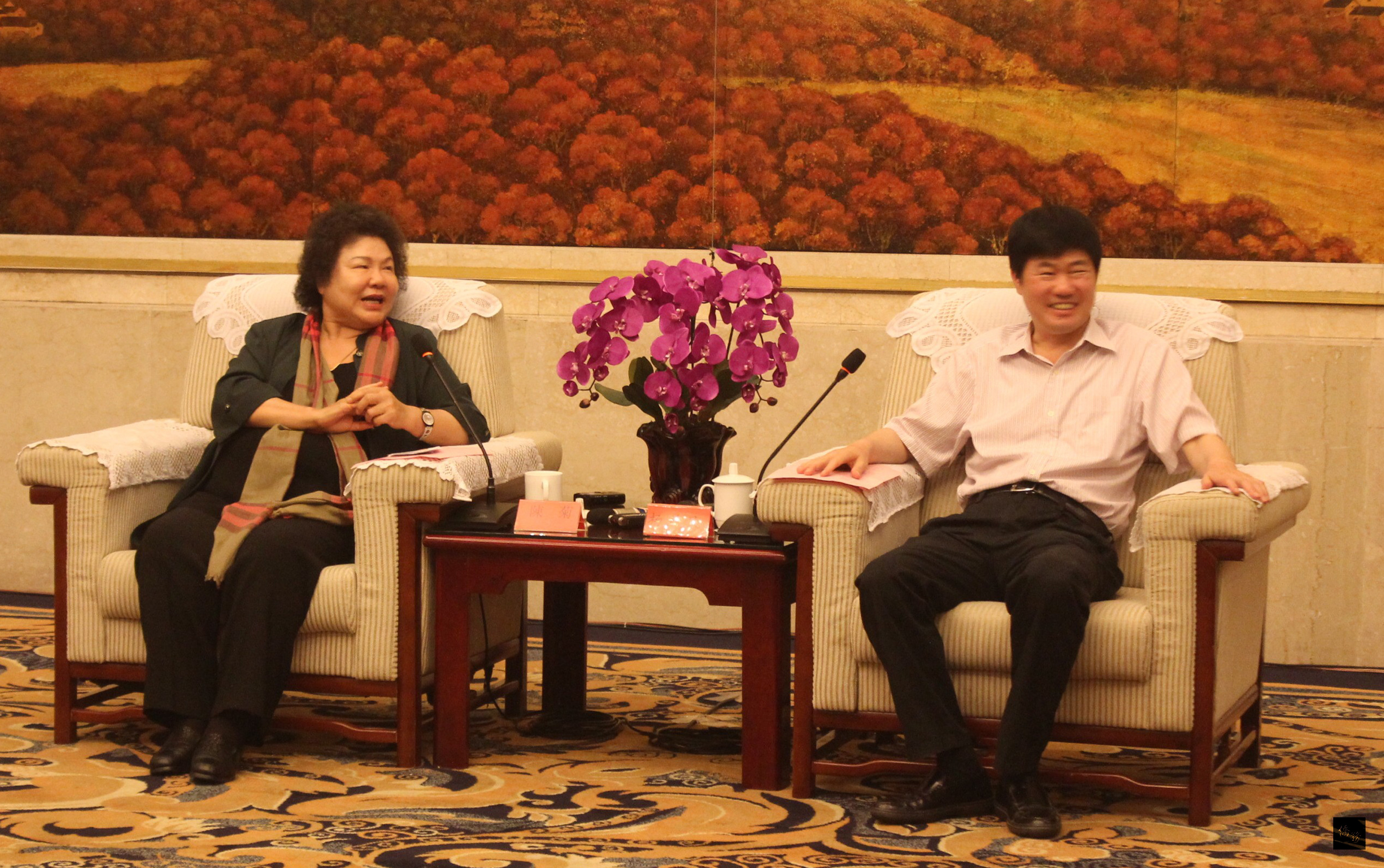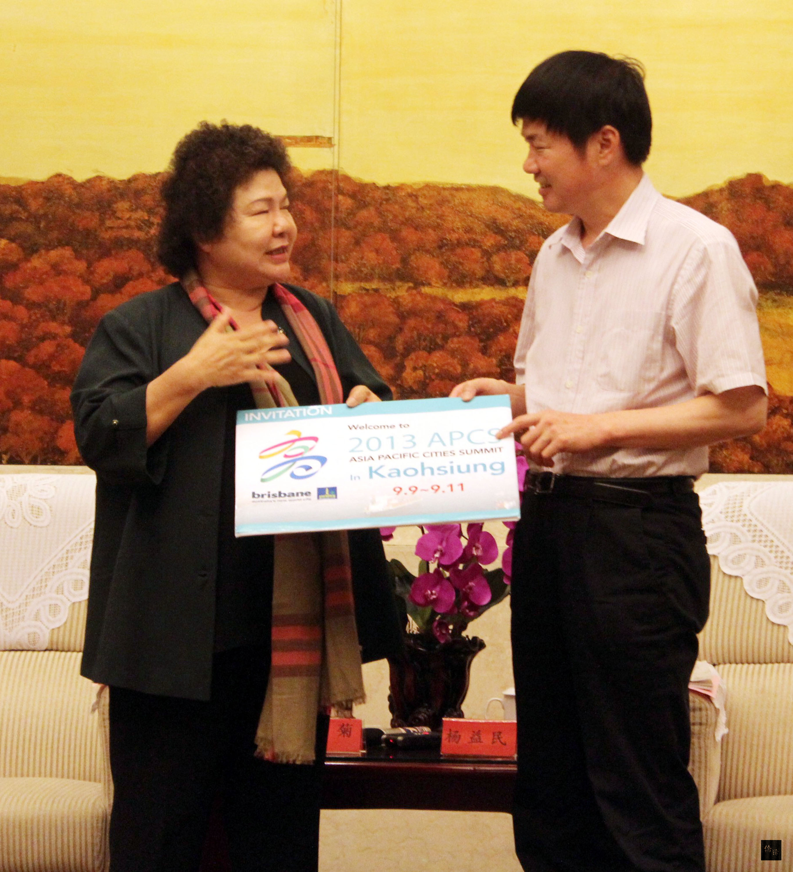 率團在中國大陸訪問的高雄市長陳菊,14日拜訪福建省福州市長楊益民,邀請他參加亞太城市高峰會,並希望增加高雄與福州間航班。