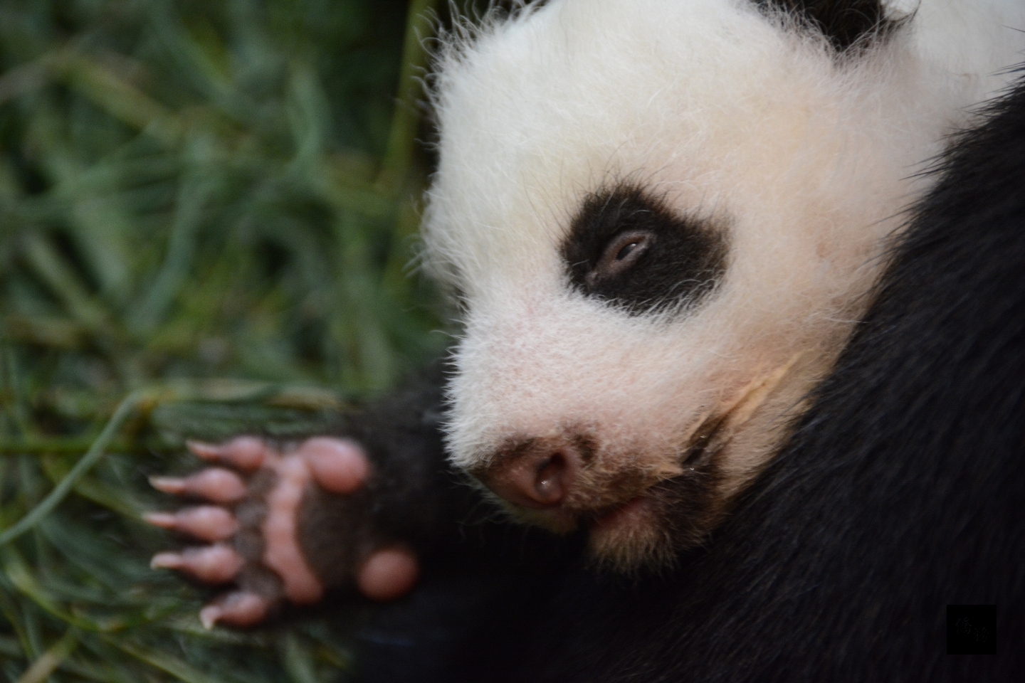 隨著成長,「圓仔」開始變臉,出現黑眼圈、黑耳朵,身上的黑色小背心越來越明顯。再到後來,「圓仔」的黑長褲和黑袖子也出現,可以看出是貓熊的招牌花色。