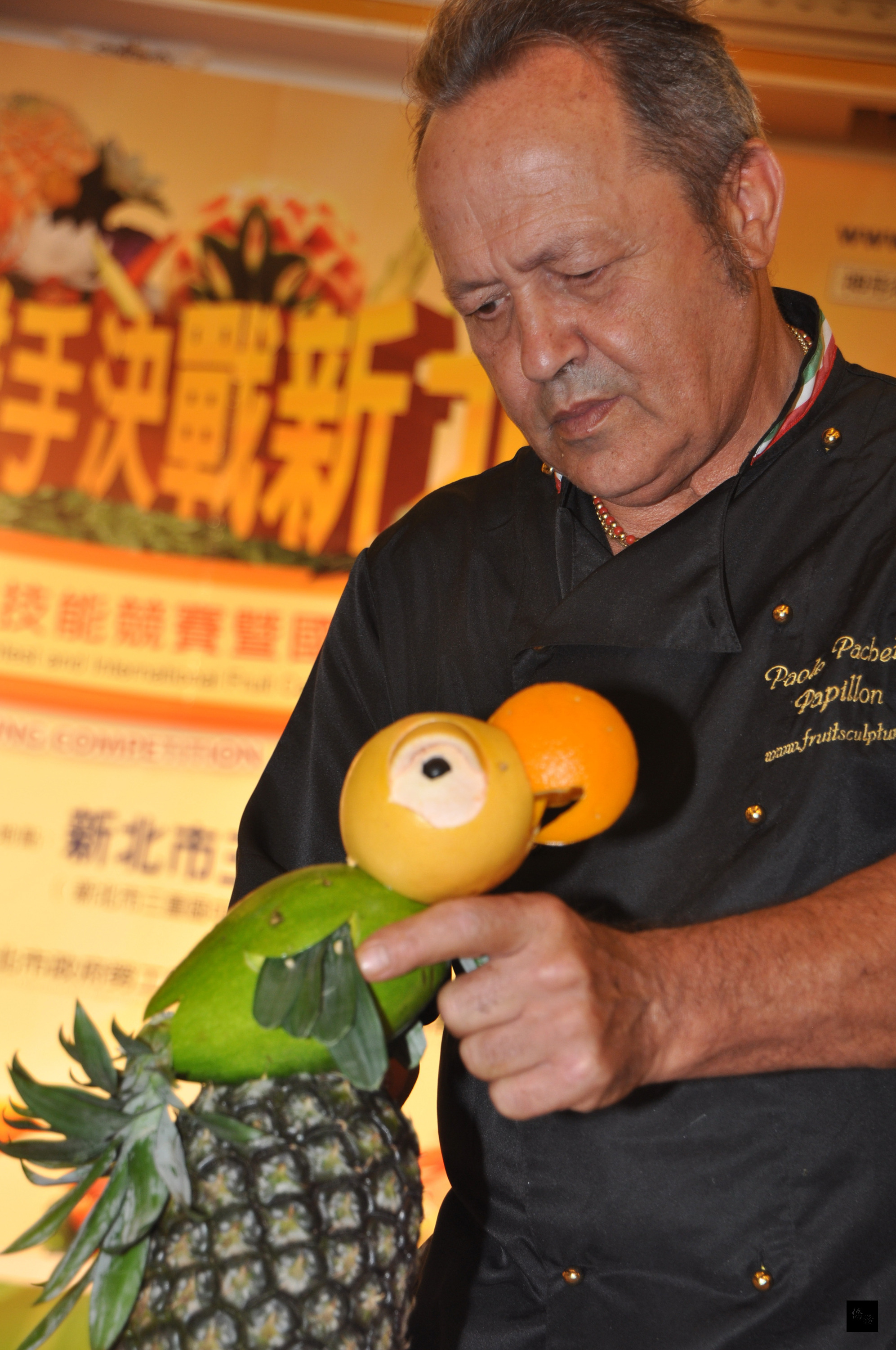 新北市府24日舉辦果雕技能競賽與國際交流,邀擅長卡通創意的義大利果雕師保羅(PAOLO Pachetti)來台教學,19日並與國內的果雕師傅黃銘波同台較勁。