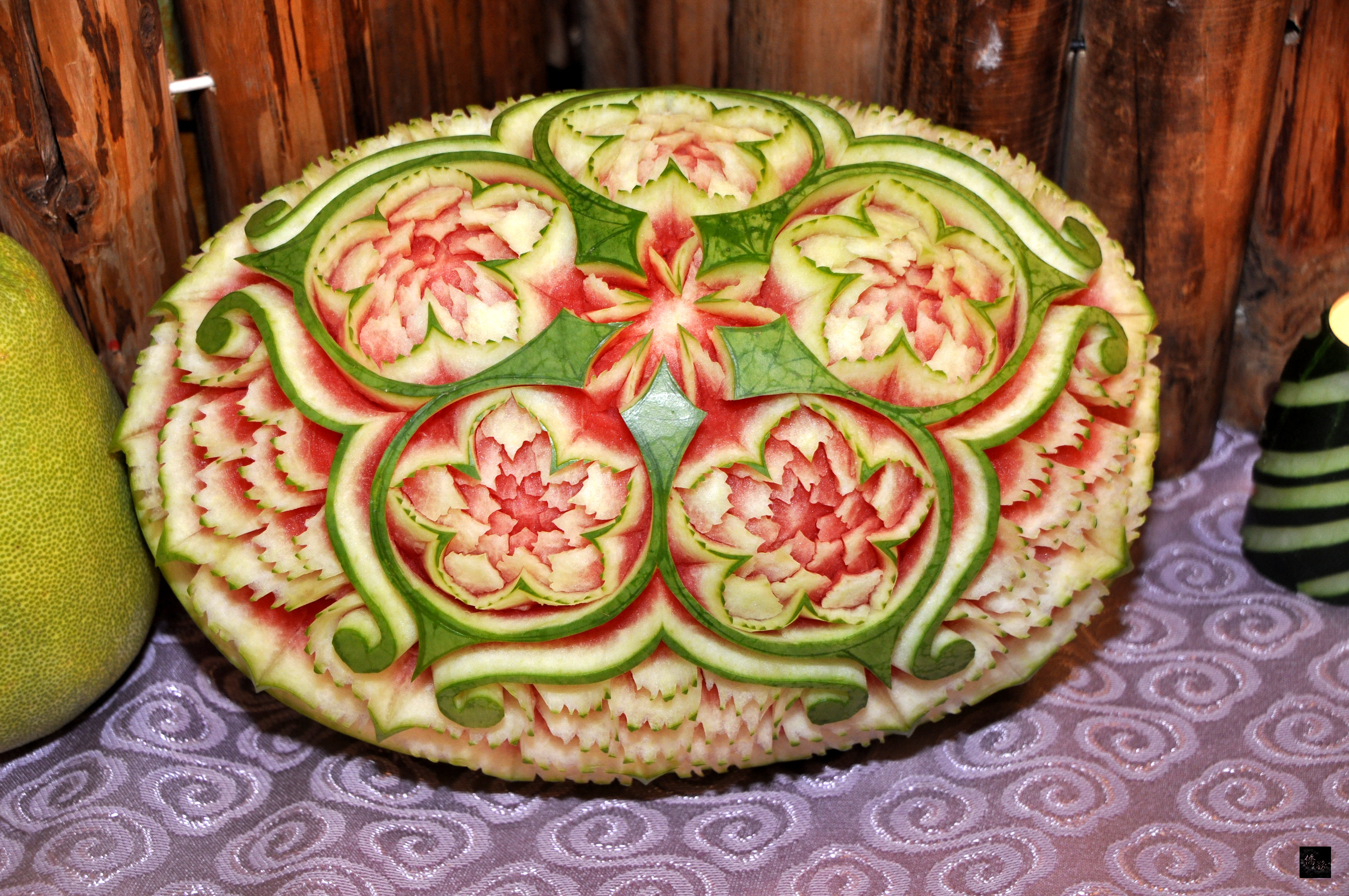 市府19日舉行記者會,由模特兒走秀展現競賽技術顧問柯明宗利用果雕造型設計的「埃及豔后」服飾,打破果雕刻板印象,凸顯果雕的美感。現場並展示柯明宗利用西瓜雕刻出的花朵、神像,透過綠色果皮與紅色果肉,展現栩栩如生的美感。