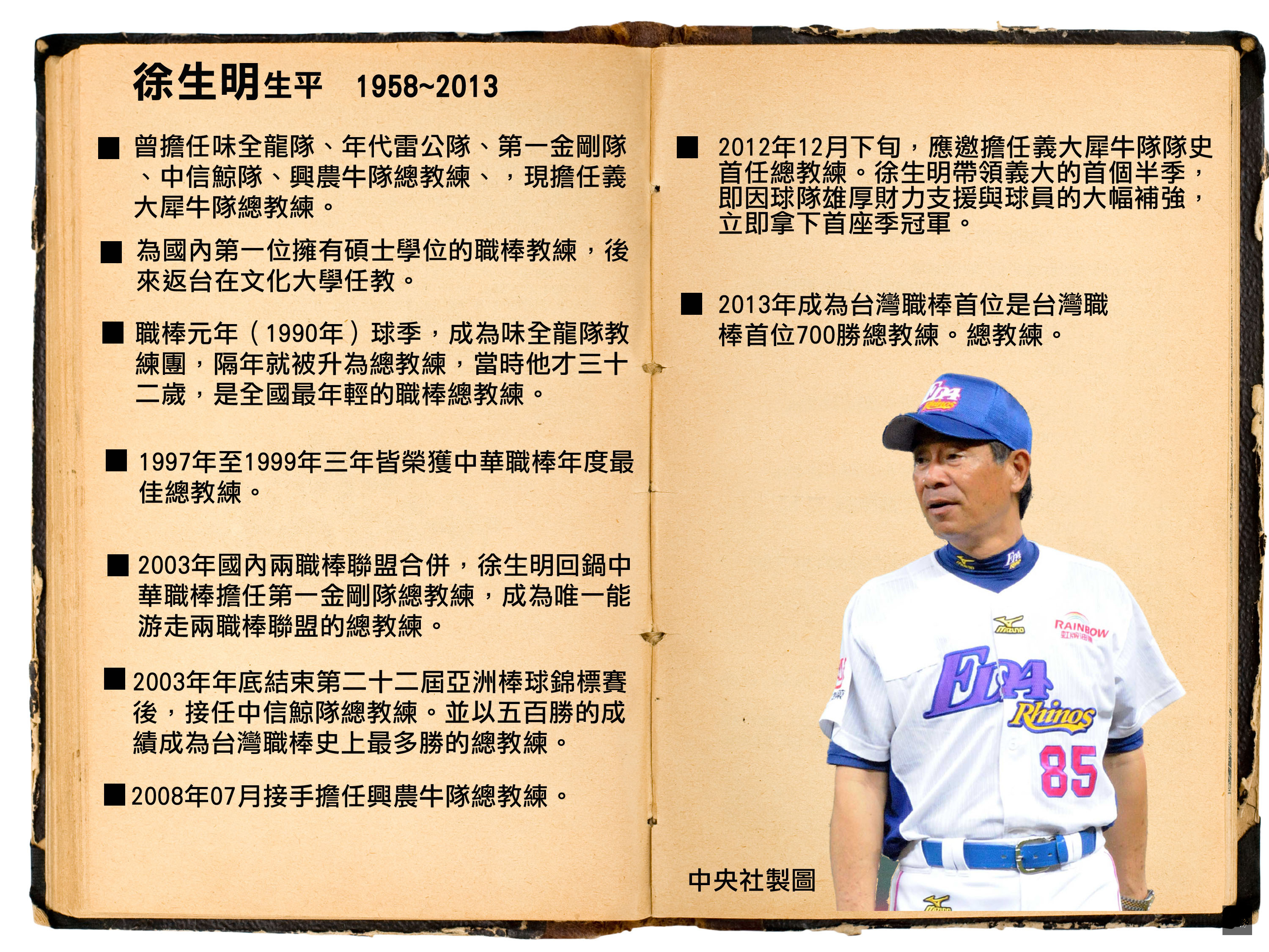 義大犀牛總教練徐生明24日晚間過世。體育署長何卓飛25日說,徐生明過世是國家人才損失,體育署將研擬頒發獎項表彰徐生明貢獻。 中華職棒義大犀牛隊總教練徐生明24日晚間過世,靈位暫設在榮民總醫院,何卓飛也到靈堂致意。 何卓飛表示,徐生明比自己小1歲,之前也聽說身體狀況控制的不錯,沒想到卻這麼年輕就過世,令人非常驚訝;行政院各部會首長組成的老棒隊日前還去新莊棒球場看比賽,賽後還去找徐生明致意,實在很難相信徐生明就這樣離開,這也是國家人才的損失。 何卓飛指出,徐生明對於棒球貢獻良多,體育署會盡快召開體育推手獎會議,討論頒發何種獎項,以表彰徐生明為台灣棒球的付出。