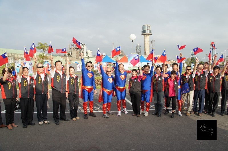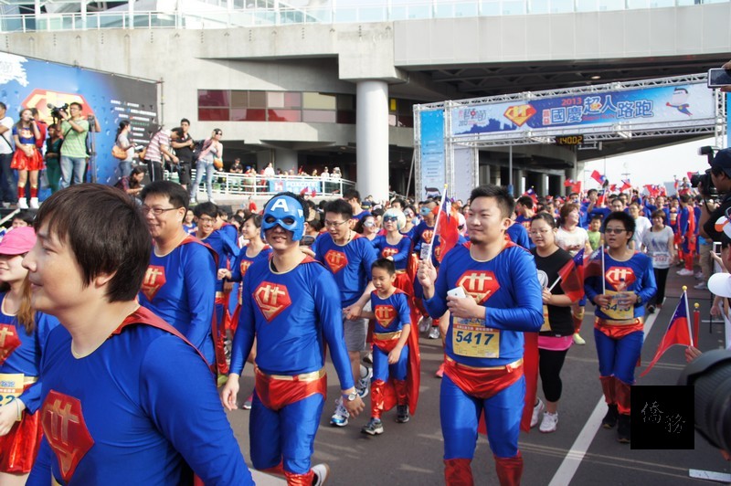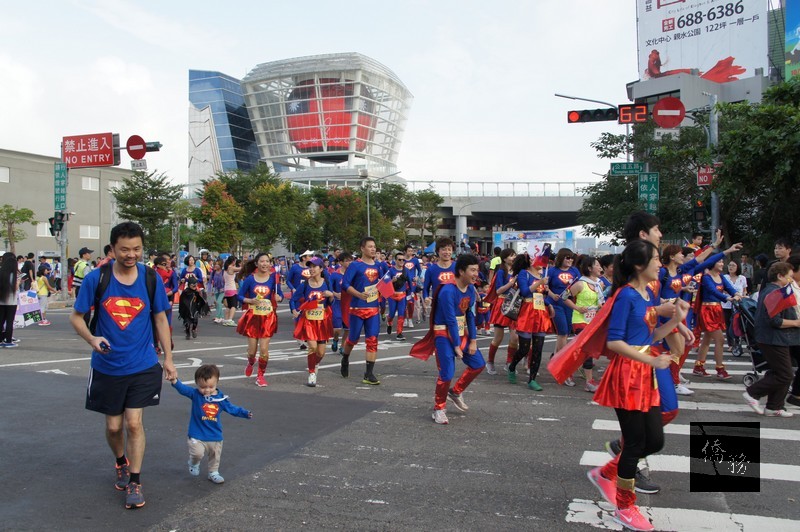另外,也有變裝成蝙蝠俠、蜘蛛人或海賊王的主角,有全家出動的超人家族,也有情侶手牽手一起出發,還有帶著寵物一起參加的朋友,連寵物也穿起超人服。新竹市府也在現場分送小國旗,許市長更帶領大家高聲祝喊「中華民國,生日快樂」。
