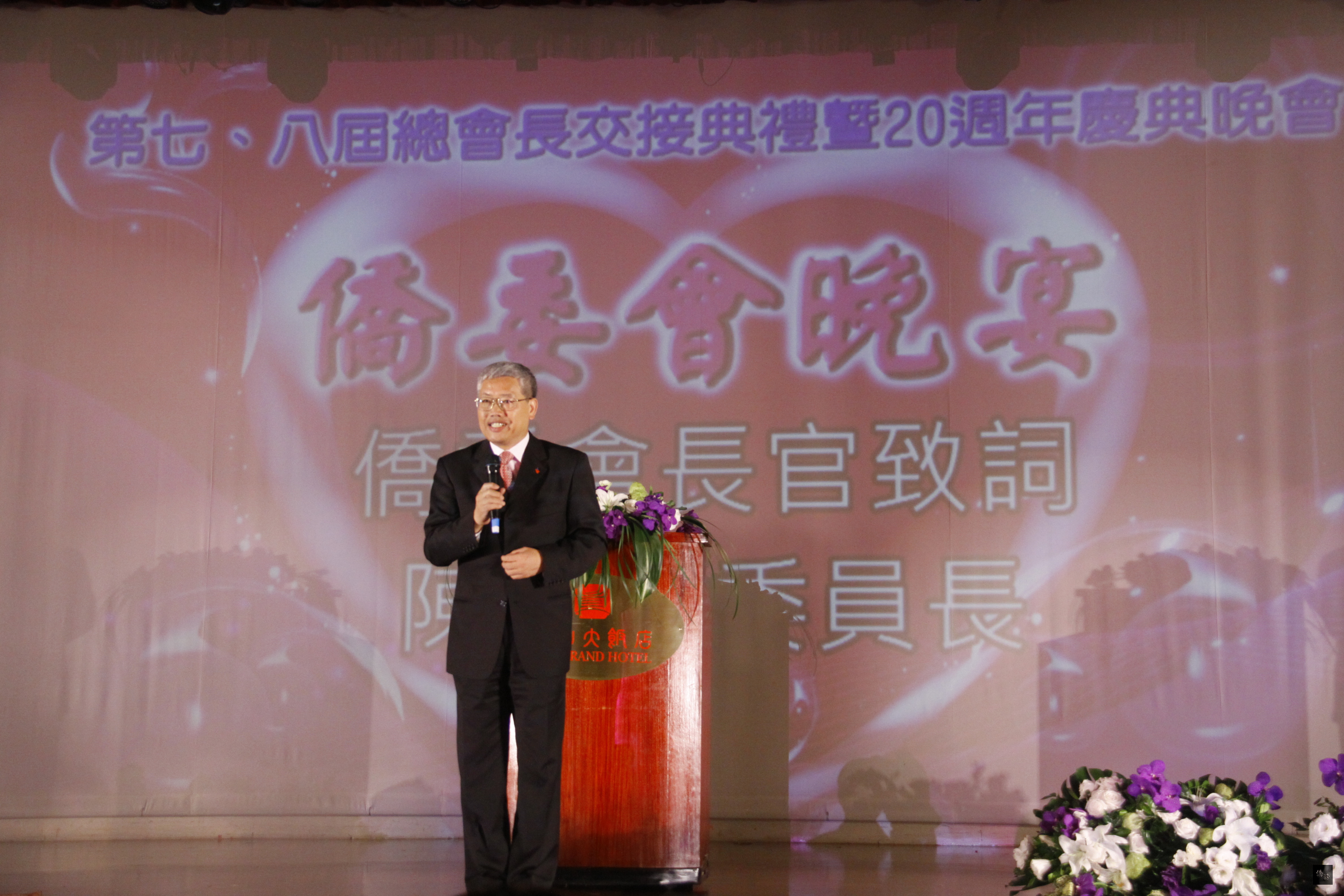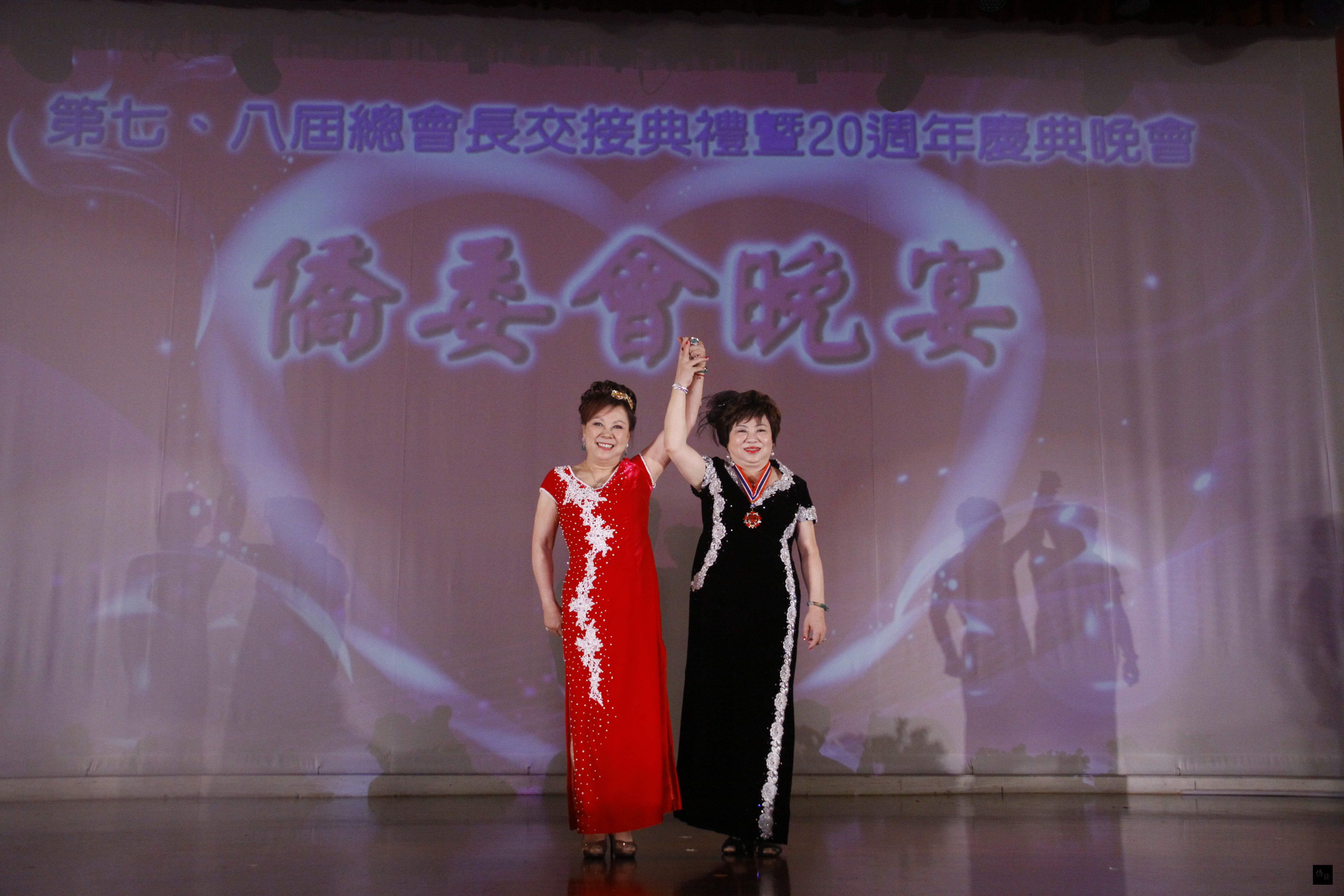 晚會另個重頭戲是總會長交接儀式,在陳委員長監交下,卸任的施郭總會長將印信交給第8屆總會長陳上春,婦聯會常委田玲玲及協會選務主委黃淑慧名譽總會長則分別為陳新任總會長佩帶責任鏈及頒發當選證書。