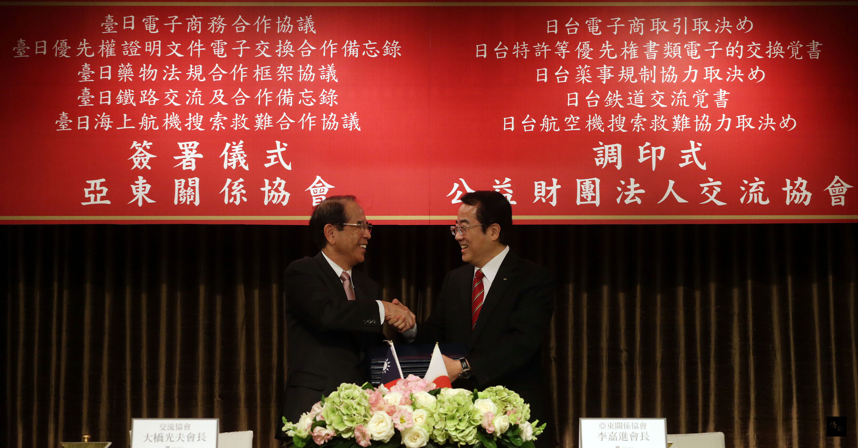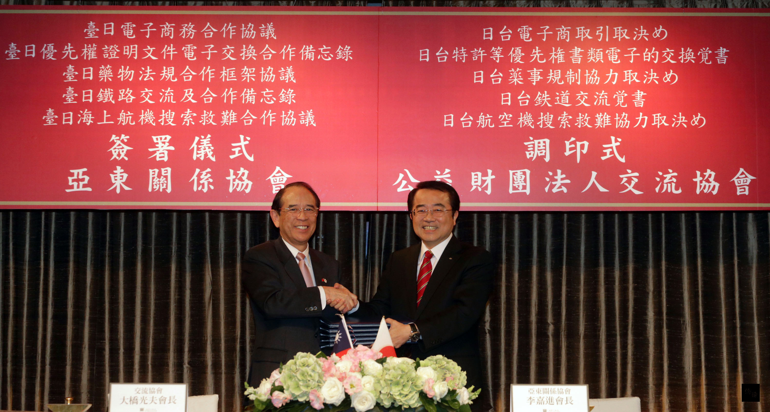 李嘉進5日下午與日本交流協會會長大橋光夫在台北國賓飯店簽署5項協議,分別是「台日電子商務合作協議」、「台日優先權證明文件電子交換合作備忘錄」、「台日藥物法規合作框架協議」、「台日鐵路交流及合作備忘錄」及「台日海上航機搜索救難合作協議」。