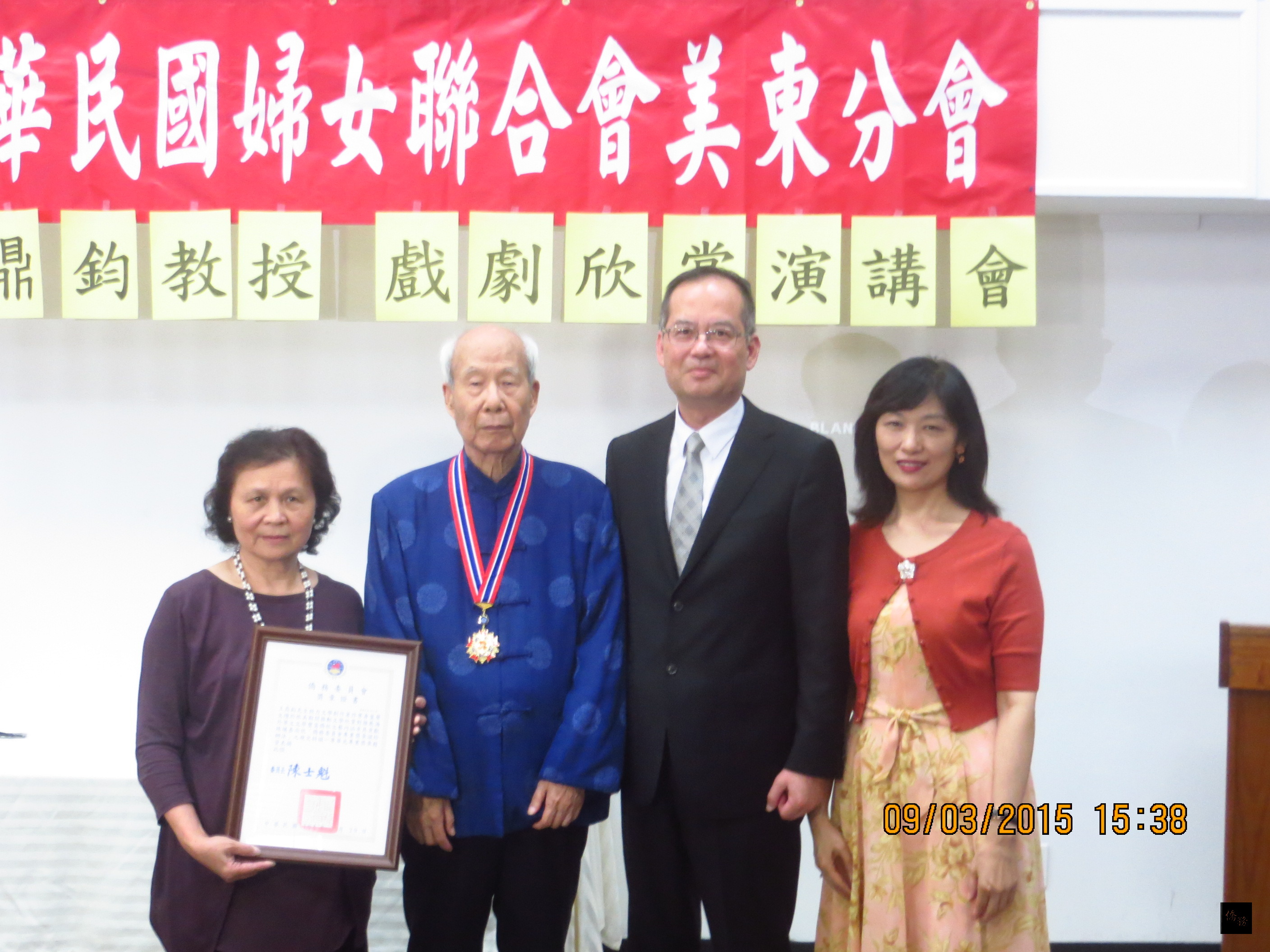 當代著名作家王鼎鈞3日在紐約僑教中心獲頒僑務委員會最高榮譽的「一等華光專業獎章」,並應中華民國婦女聯合會美東分會之邀,以「戲劇欣賞」進行專題講座,近200位僑胞將僑教中心擠得水洩不通。