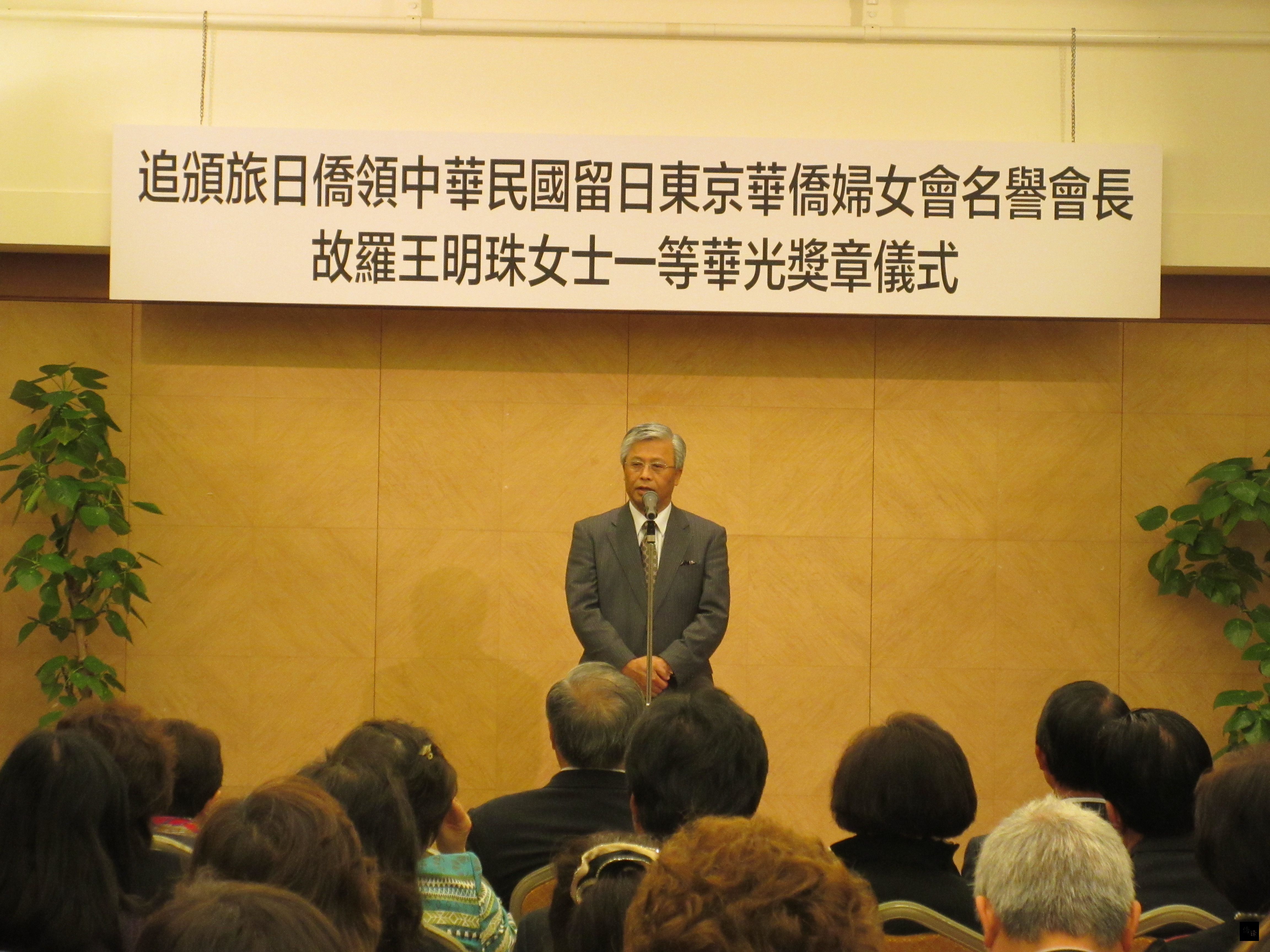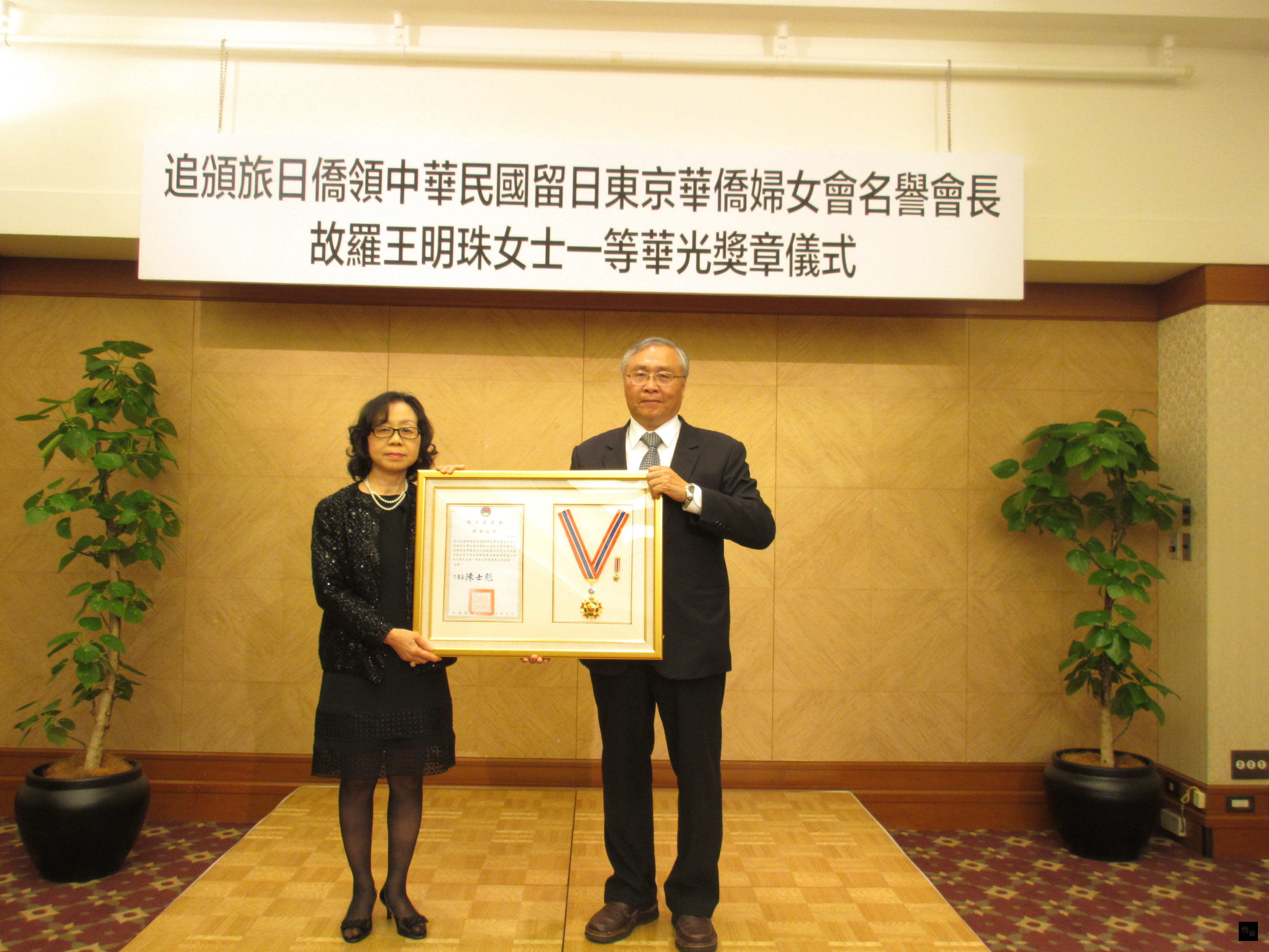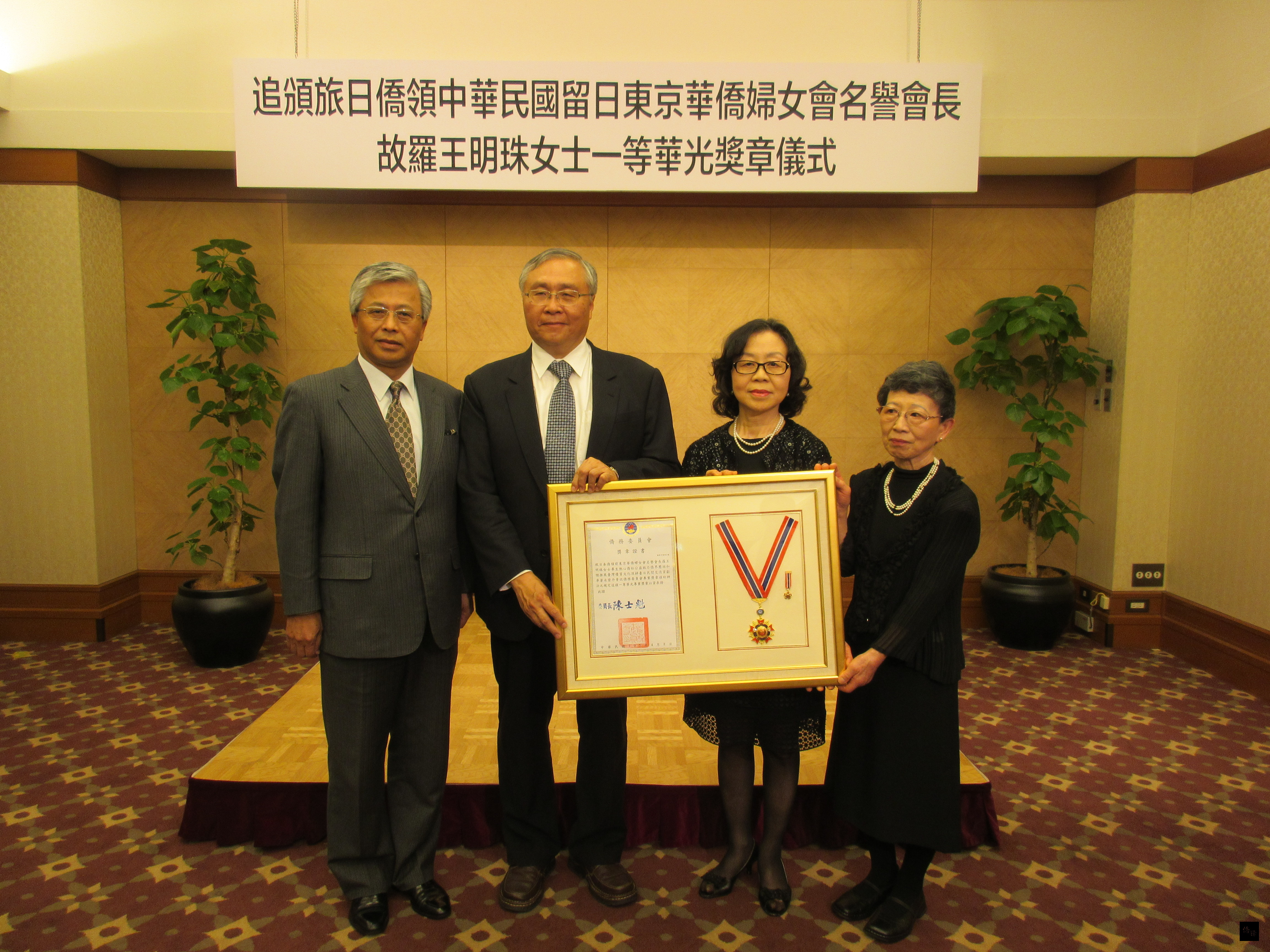 僑務委員會主任秘書張良民23日特別前往日本東京,主持追頒中華民國留日東京華僑婦女會名譽會長故羅王明珠女士華光專業獎章儀式,由羅王明珠的兩位女兒羅政子及羅秋英代表領獎,駐日本副代表陳調和、東京婦女會理監事及旅日僑領都出席觀禮,場面莊嚴肅穆。