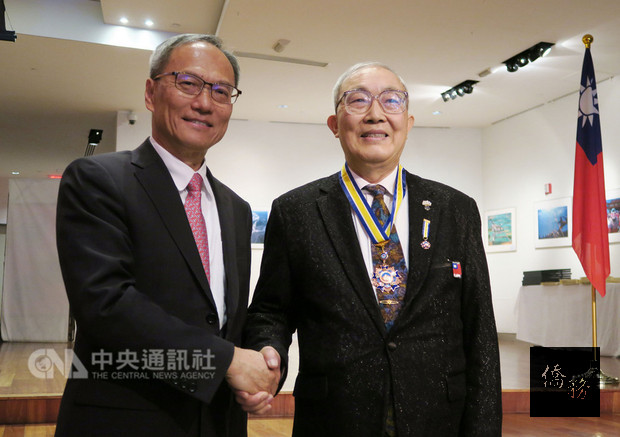 (中央社訊)前紐約中華公所主席蕭貴源出身台灣,服務僑界40年,今天成為玉山僑務專業獎章首位得主。僑委會委員長吳新興感謝蕭貴源擔任主席期間不遺餘力支持政府,堪稱台灣人的驕傲。