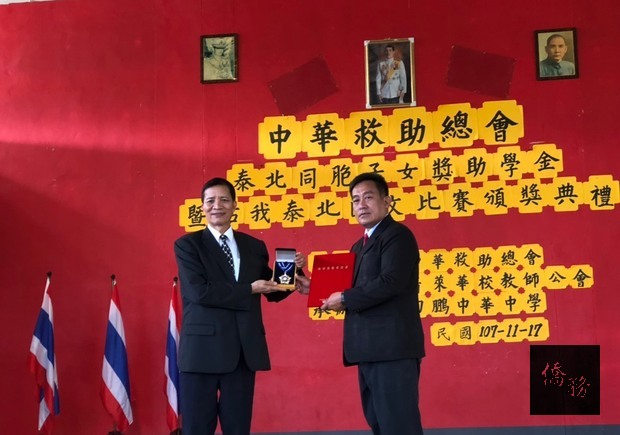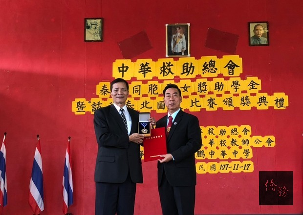 僑務委員會副委員長高建智於17日訪問清萊中華中學,並出席中華救助總會舉辦的「泰北同胞子女獎助學金頒獎典禮」及「話我泰北」圖文比賽,並於活動現場頒發僑務委員會海華榮譽獎章予清萊華校教師公會名譽會長顏協清及會長王紹章,以表彰他們長期貢獻泰北華校,推展正體華文教育。