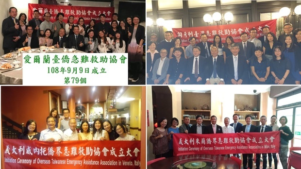 僑委會表示,歐洲4處急難救助協會,日前在吳新興見證下正式成立,包括旅居愛爾蘭的僑胞鄭惠文發起成立「愛爾蘭台僑(愛台)急難救助協會」,9日舉辦成立大會;匈牙利僑胞劉倖佑發起「匈牙利台灣急難救助協會」,於10日成立;義大利的「義大利威內托僑界急難救助協會」與「義大利米蘭僑界急難救助協會」也分別在12日、13日相繼成立。現在全球共有82個僑界急難救助協會。