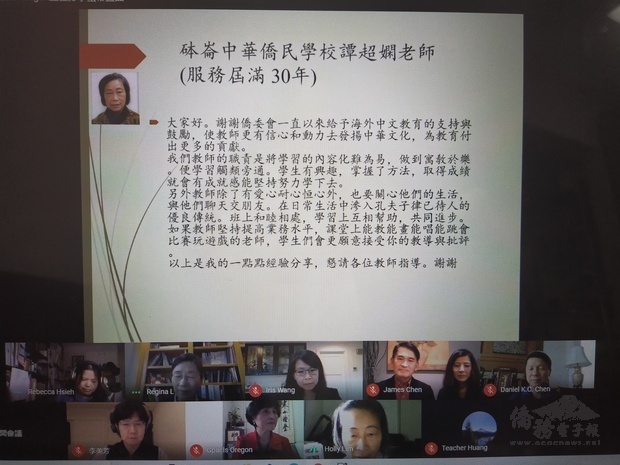 接下來接續舉辦座談會,僑委會僑教處處長榮幼娥特別錄製致詞影片,勉勵老師們透過座談會討論交流、經驗分享,強化僑校教學品質及與家長溝通,共同在後疫情時代,提升學生至僑校學習華語文之意願。座談會共有五位老師分享教學經驗,波特蘭中文學校黃芬芳老師分享使用僑委會購贈教材及使用Google Classroom的心得;主流學校簡信華老師分享如何在網路上激發幼兒學習興趣,分享有趣教材;發一崇德文教基金會華盛頓分會林怡君老師分享如何利用全球華文網輕鬆備課;西雅圖華文學校傅琬婷老師分享「學華語向前走」使用心得;大波特蘭華文學校聯誼會會長陸璋則提供從實體走向網路上經驗談,以及如何運用全球華文網教師部落格。充實豐富的分享,讓老師們收穫滿滿,共同歡度一場有意義的教師節慶祝活動。