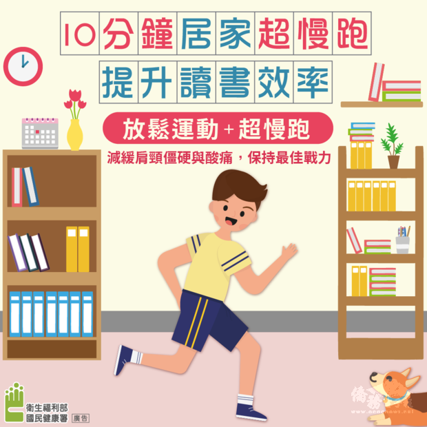 雙十連假將近,許多國高中(職)、大專院校生為了準備連假後的第1次段考,可能長期處於坐姿低頭的同一姿勢讀書,因此常會有肩頸痠痛、注意力不集中等現象產生。國民健康署王英偉署長提醒考生除規律作息及充足睡眠外,提供一套在家超慢跑運動,讓莘莘學子們能夠以伸展運動加上10分鐘的居家超慢跑來舒緩身心,提升讀書效率!