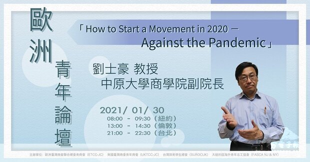 線上論壇由青商會會長許伯偉博士主持,邀請到中原大學商學院副院長劉士豪教授主講,劉教授主要從事網路人類行為研究,論壇以How to start a movement─against the pandemic為主題,同時圍繞著網路、經濟、新冠疫情、社交媒體等相關議題。