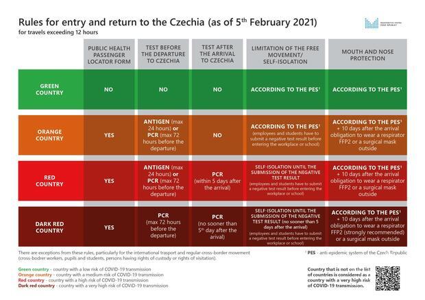 - 新增極高風險國家(深紅色)類別,自此類國家入境捷克者,須遵守最嚴格防疫規範,入境前必須繳交48小時內有效之陰性PCR檢測結果,入境5日後須再繳交第二次陰性檢測結果,並須實施自我隔離直至繳交結果;