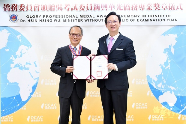 僑委會依據「僑務委員會專業獎章頒給辦法」核定頒贈吳考試委員最高榮譽的「華光僑務專業獎章」,感謝考試委員吳新興的豐功偉績,奠定僑務工作紮實基礎。