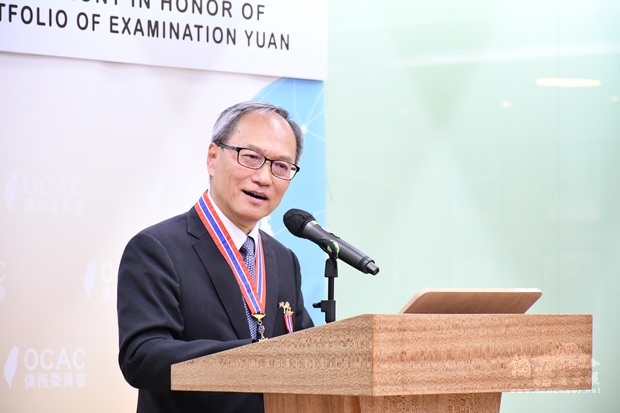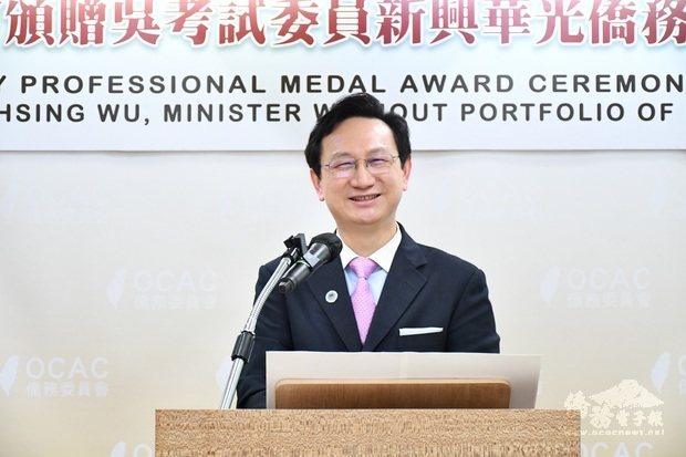 考試委員吳新興首先感謝張富美,過去邀請他來到僑委會擔任副手,在政黨輪替之時,即使面臨極大的挑戰與困難,仍並肩作戰推動僑務工作、服務全球僑胞;他也感到非常榮幸能從童委員長手中獲頒華光僑務專業獎章,並懷著感恩的心情接受這份榮譽。吳新興細數著每位與他共事過的所有同仁,就如同親友一般,感謝大家一路上的支持,他也期勉未來僑委會的團隊能在童委員長的領導下,持續服務海外僑界;「一日僑委會,終身僑委會」,他也將給予僑委會全力支持與協助。