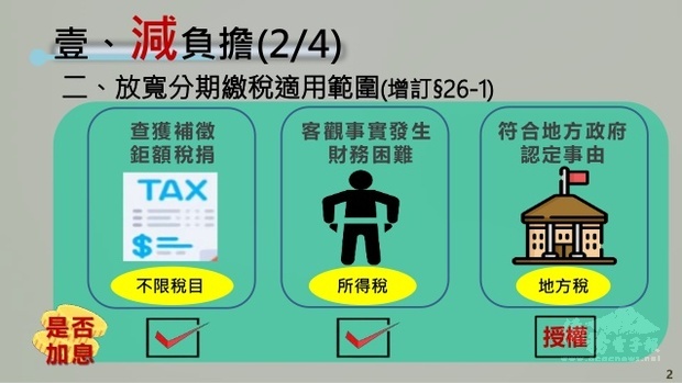 五、為協助有繳納意願之納稅義務人繳納稅捐,增訂放寬納稅義務人申請適用加計利息分期繳納情形。(修正條文第26條之1)