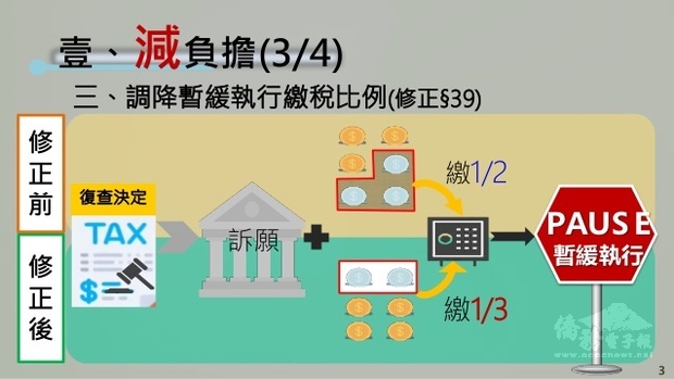 七、參酌司法院釋字第224號解釋意旨及多數國外立法例,為降低納稅義務人因強制執行可能發生不能恢復損害,將納稅義務人繳納復查決定應納稅額得暫緩移送執行之金額比例由「半數」調降為「三分之一」。(修正條文第39條)