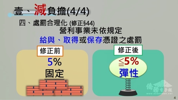 九、參酌司法院釋字第685號解釋意旨,為避免個案處罰過苛,對於營利事業未依規定給與、未取得或未保存憑證之罰鍰,由按查明認定總額「處百分之五」之固定比率修正為「處百分之五以下」。(修正條文第44條)