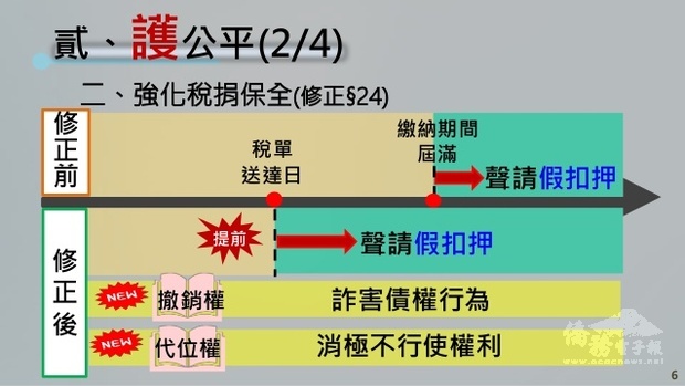四、為利稅捐保全,對於規避稅捐執行之欠稅案件聲請法院假扣押時點,由「欠繳應納稅捐」修正為「法定繳納期間屆滿或繳納通知文書送達後」;另增訂稅捐之徵收準用民法及信託法有關代位權及撤銷權規定。(修正條文第24條)