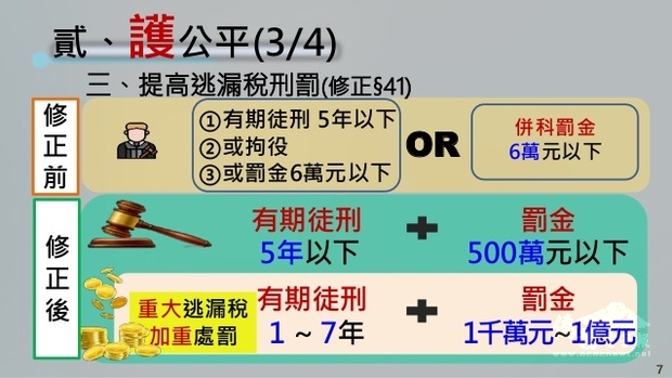 八、提高逃漏稅刑事罰金(由6萬元以下修正為500萬元以下),增訂逃漏稅達一定金額者(個人1,000萬元以上,營利事業5,000萬元以上)加重處罰,處1年以上7年以下有期徒刑,併科1,000萬元以上1億元以下罰金。(修正條文第41條)