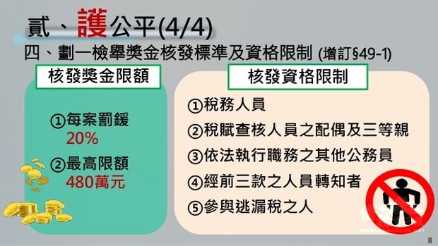 十、增訂核發檢舉獎金、資格限制及核發標準相關規定。(修正條文第49條之1)