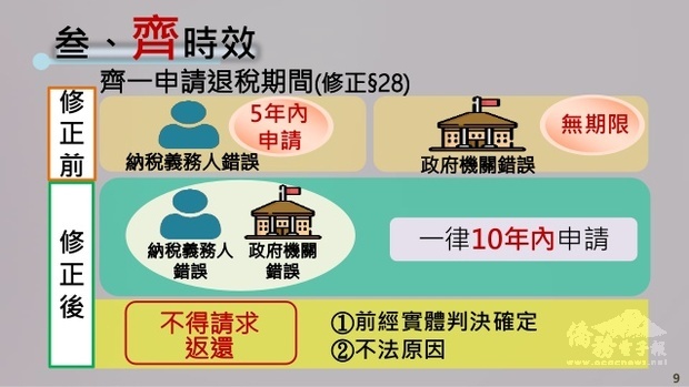 六、配合行政程序法有關人民公法上之請求權之規定,修正錯誤溢繳稅款之申請退還期間為10年。(修正條文第28條)