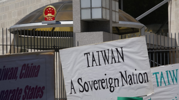 對於北京在台海周遭持續大規模軍演,升高區域緊張局勢,數十名大華府地區台灣僑胞今天下午頂著豔陽前往中國駐美大使館舉布條抗議。