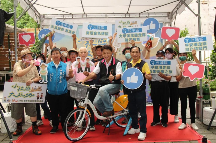 文化局今天在西屯區惠來里福德祠舉辦「2022台中市社區深度文化之旅記者會」,由中市文化局副局長曾能汀踩動腳踏車,宣告深度之旅啟程,參與的社區也到場設攤展示,號召大小朋友一起來社區當「玩咖」。