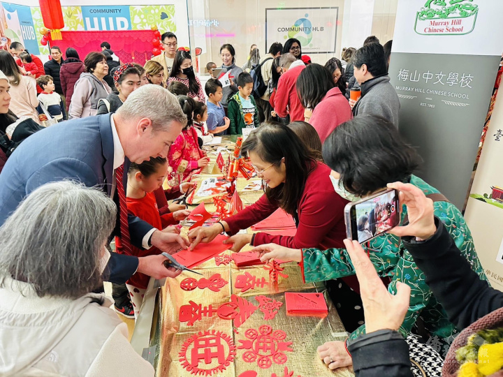 梅山中校臺灣華語文學習中心也在此宣傳招生,並有傳統手工剪紙和名書法家薛恭暉現場揮毫,吸引絡繹不絕的人潮前來訊問,展現臺灣文化至美國主流社區。文創交流促進會和北極星青少年義工準備了許多小禮物分送給小朋友,整場活動讓全家大小一起同樂,慶祝新春佳節。