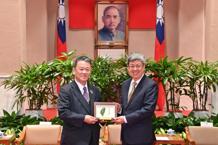 訪賓一行由僑務委員會呂元榮副委員長陪同,前來行政院晉見院長,行政院政務委員兼代理發言人羅秉成也在座。陳院長致贈魏禧之會長「玉見臺灣」-玉石立體雕刻,雙方並合影留念。
