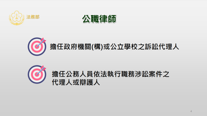 為協助政府機關(構)及公立學校處理法律諮詢及訴訟等案件,以落實司法改革國是會議決議,行政院會3月30日通過法務部擬具的「律師法」部分條文修正草案,建立「公職律師」制度,將函請立法院審議。
